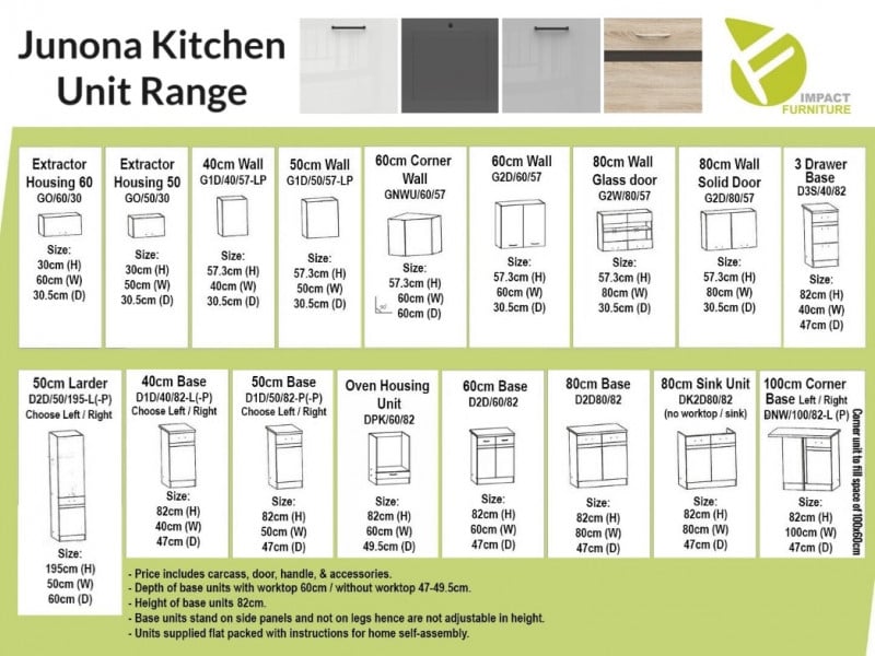 The Junona range offers a huge variety of base and wall cabinets which will allow you to personalise your kitchen whilst still providing space to store all your kitchenware and ingredients.