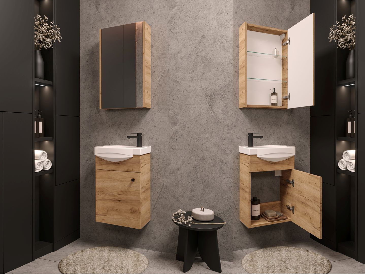 Upgrade your bathroom with this slimline mirror cabinet in a warm Gold Craft Oak wood effect finish. Compact yet functional, the 400mm mirrored cabinet provides a smart, space-saving solution. It offers both a mirror and valuable storage in one sleek unit.