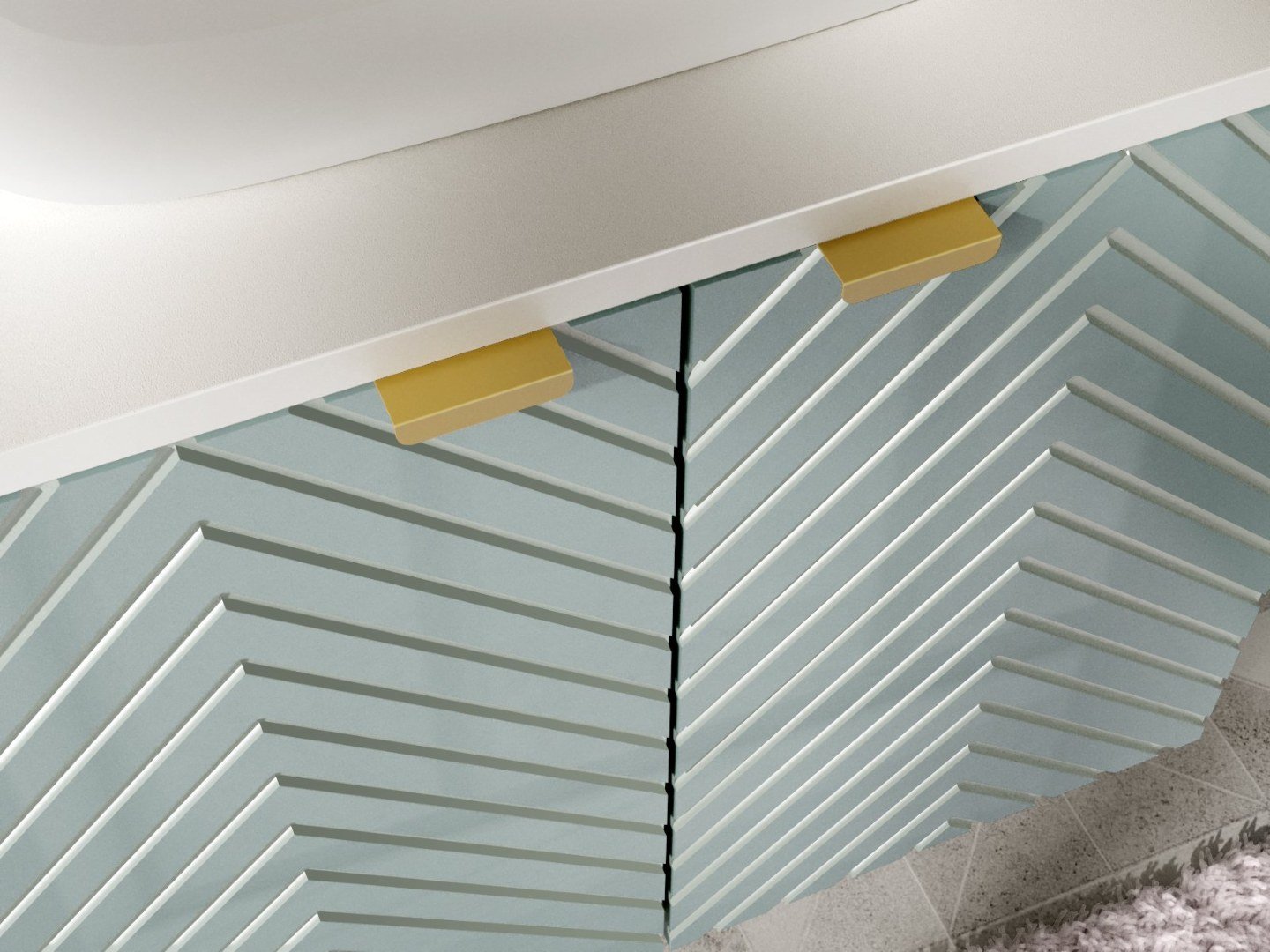 Cara Green Bathroom wall hung 800mm bathroom vanity unit with two doors. The unit has modern Textured Herringbone Ribbed Fluted fronts and slim gold grab handles included as standard.
