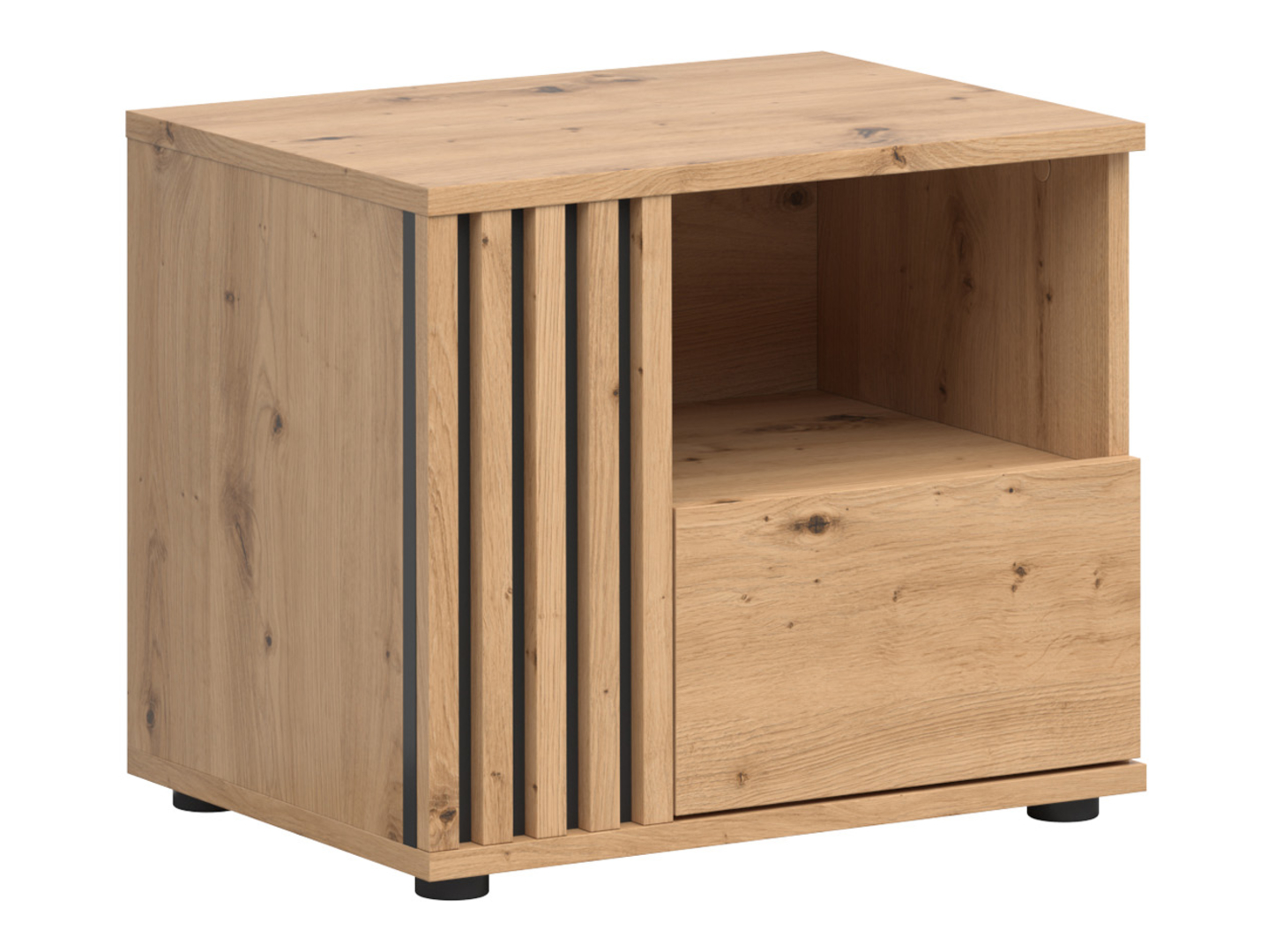 Bedside cabinet, with drawer and open shelf in a rich combination of Artisan oak and black matt with a beautiful oak effect slat panelling. This side table cabinet features subtle black metal handle, soft closing runners and scratch resistant finish on top and fronts.