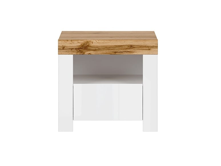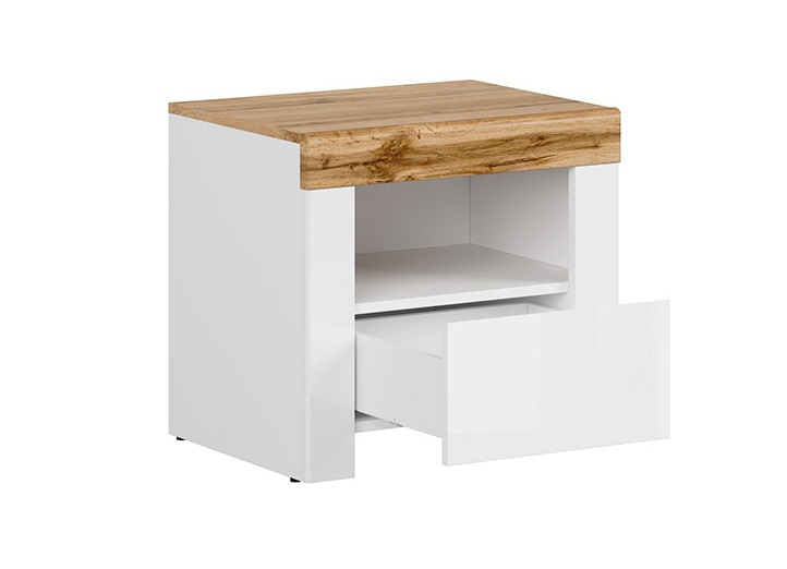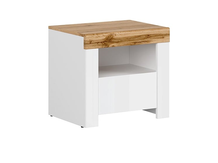 Practical and beautiful bedside cabinet with 1 drawer, in Scandinavian style with fronts in White Gloss finish and accent in Oak Wotan finish, perfect to combine with other Holten Scandi bedroom items.