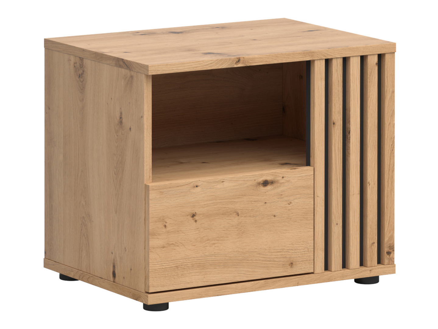 Bedside cabinet, with drawer and open shelf in a rich combination of Artisan oak and black matt with a beautiful oak effect slat panelling. This side table cabinet features subtle black metal handle, soft closing runners and scratch resistant finish on top and fronts.