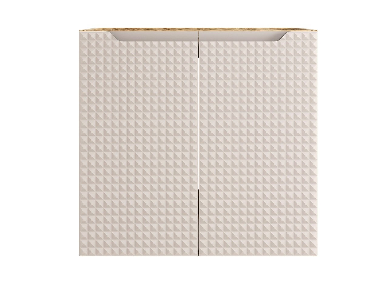 The wall-mounted design enhances the feeling of space while the interior offers convenient hidden storage. Its maximalist look, with bold textured fronts and contrasting oak effect cabinet body, creates a striking, upscale aesthetic—ideal for any contemporary interior.