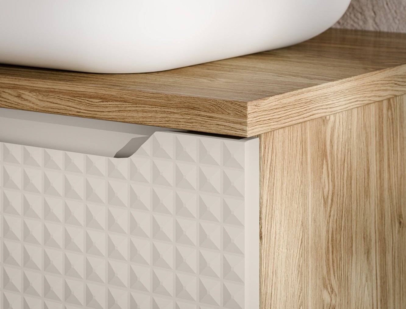 Explore the exotic world of the LUXOR furniture collection, redefining the concept of modern design. Each element of this collection exudes simplicity and sophistication, simultaneously acting as a unique work of art. The textured beige fronts of the furniture create a stunning pattern that adds depth and character to each piece and contrast beautifully with the oiled oak effect cabinets. A luxurious bathroom at an excellent price!