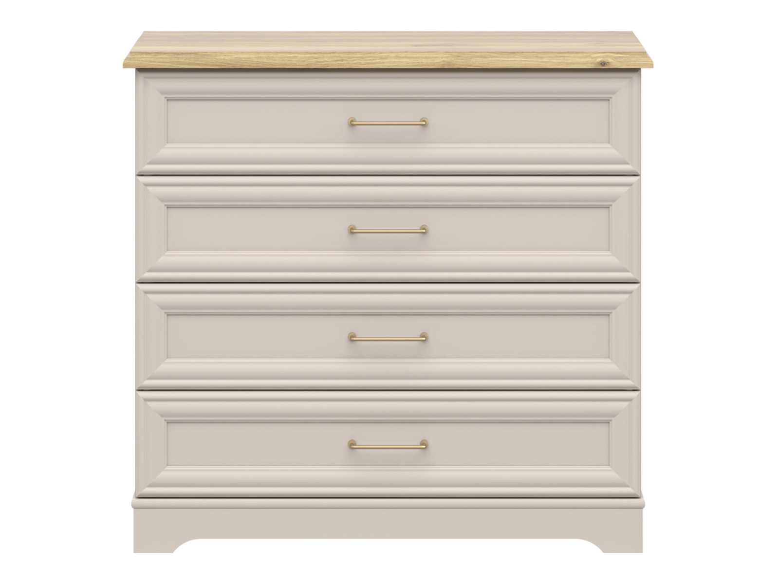 Chest of drawers storage cabinet, with 4 large drawers in a stylish Cashmere Beige with Mauvelle oak effect finish top and subtle shaker fronts. This bedroom storage cabinet features stunning brushed gold handles, soft closing runners and scratch resistant finish on top and fronts.