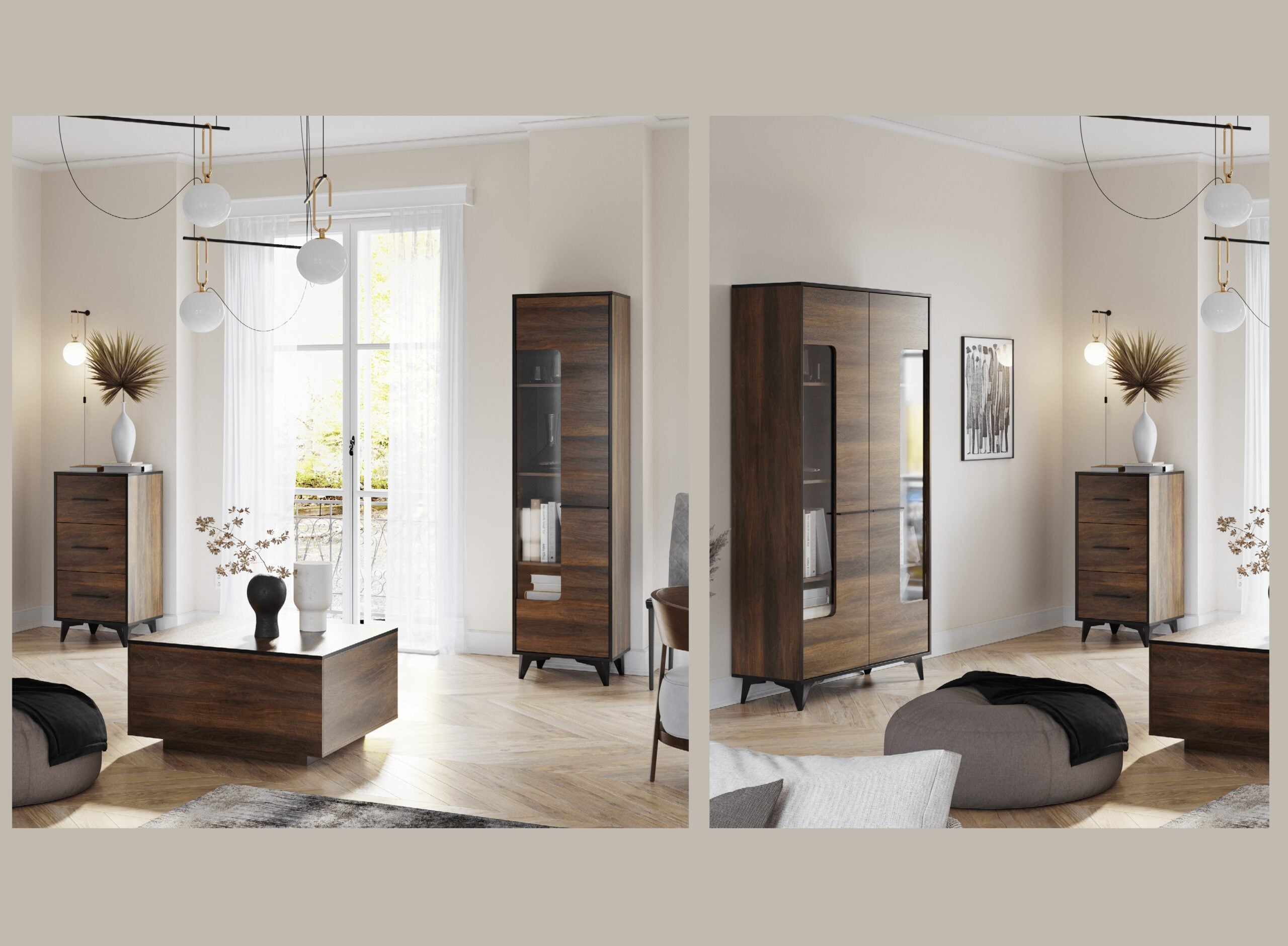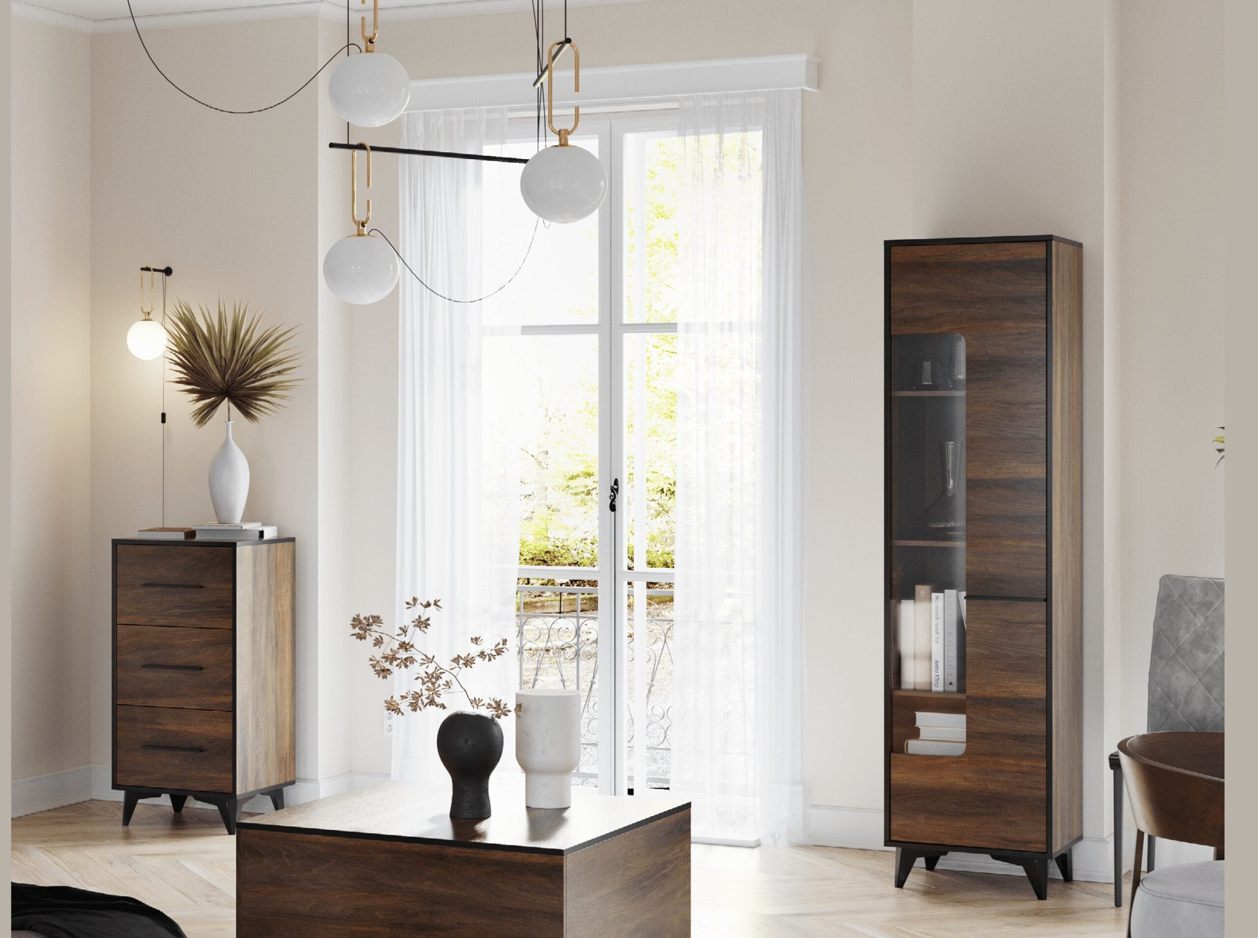 The Frida is a beautiful mid century modern furniture range. Living room and bedroom furniture is finished in rich Shirin Walnut wood effect which contrasts beautifully with the black edged frame. This contemporary range offers space saving furniture design and has slimline black handles and tapered black legs. Frida modern furniture collection augments any contemporary interior to create a cosy and welcoming space in your home.