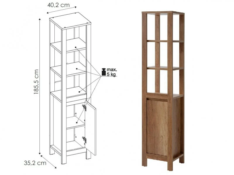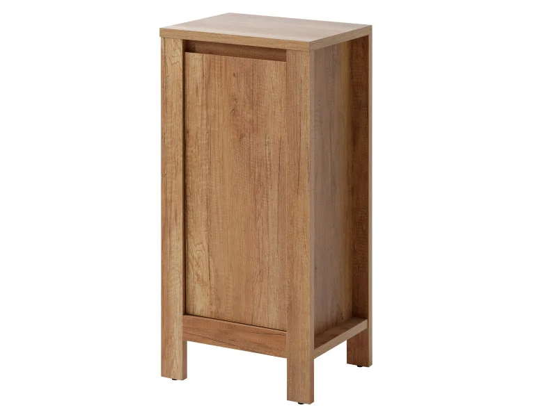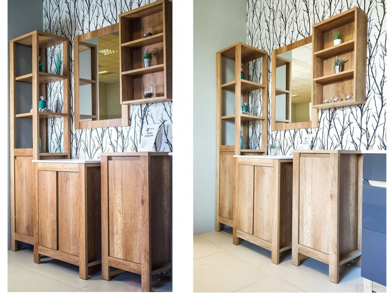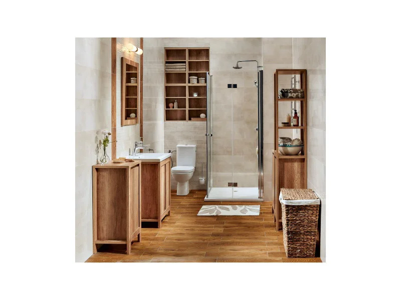 A freestanding 800mm bathroom cabinet furniture set, including 80cm vanity unit, tall cabinet, wall shelves, wall mounted mirror and small freestanding cabinet in Country Oak finish from modern Classic Oak bathroom furniture range.
