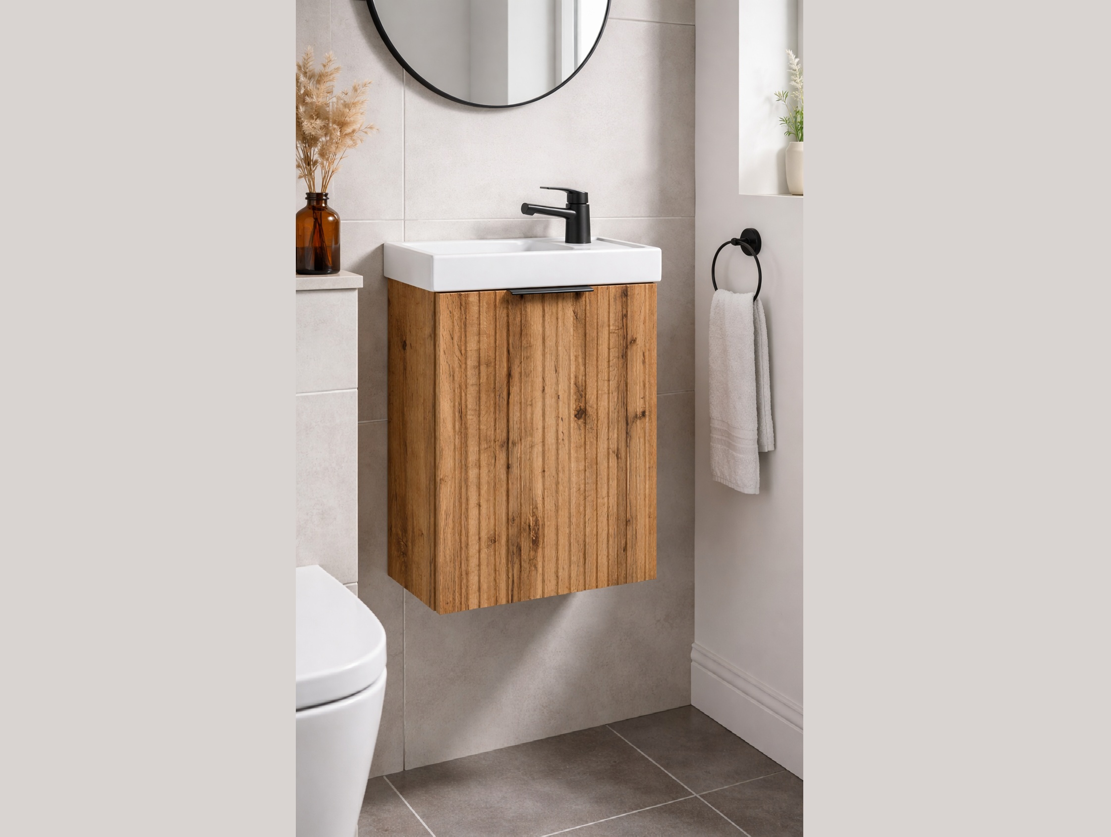 Maximise space with this 400mm Oak Cloakroom Vanity Unit with Sink. Designed for small bathrooms, cloakrooms, and compact en-suites, this slim wall-mounted cabinet delivers both style and function. Moreover, the textured ribbed fluted front adds depth and a premium modern finish.