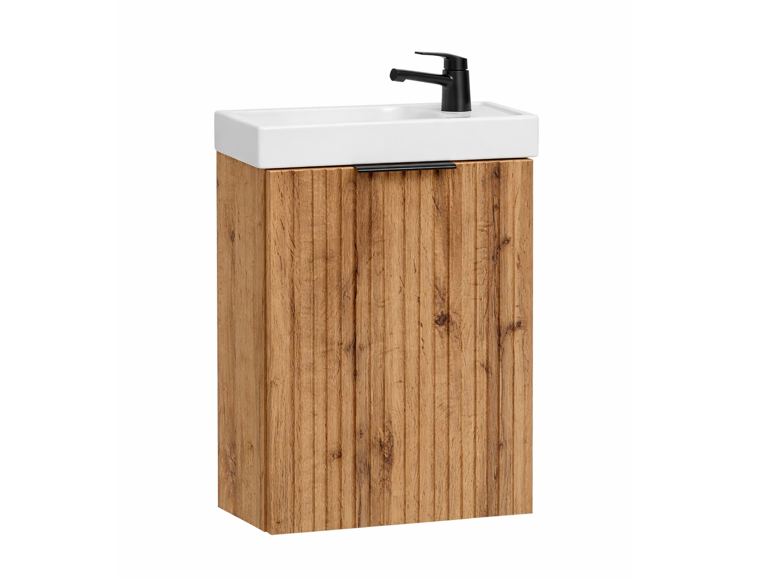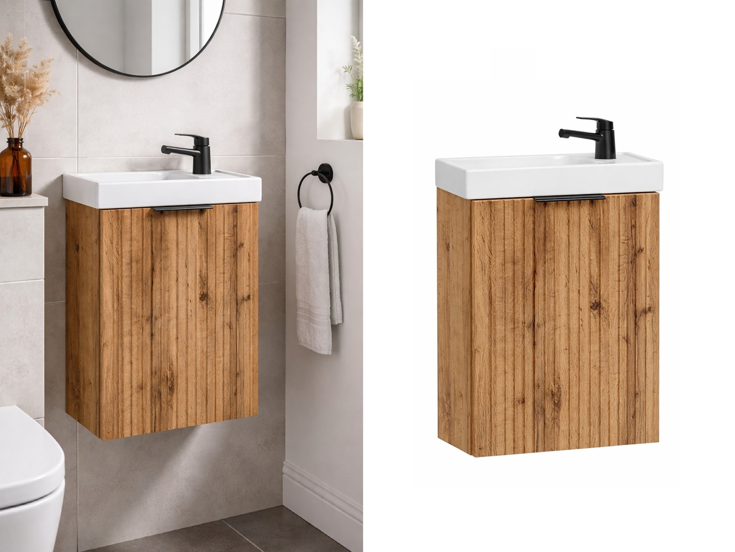 Cloakroom Vanity Unit with Small Sink Wash Basin Slimline Fluted Ribbed Oak 400mm Wall Hung Cabinet – Adel