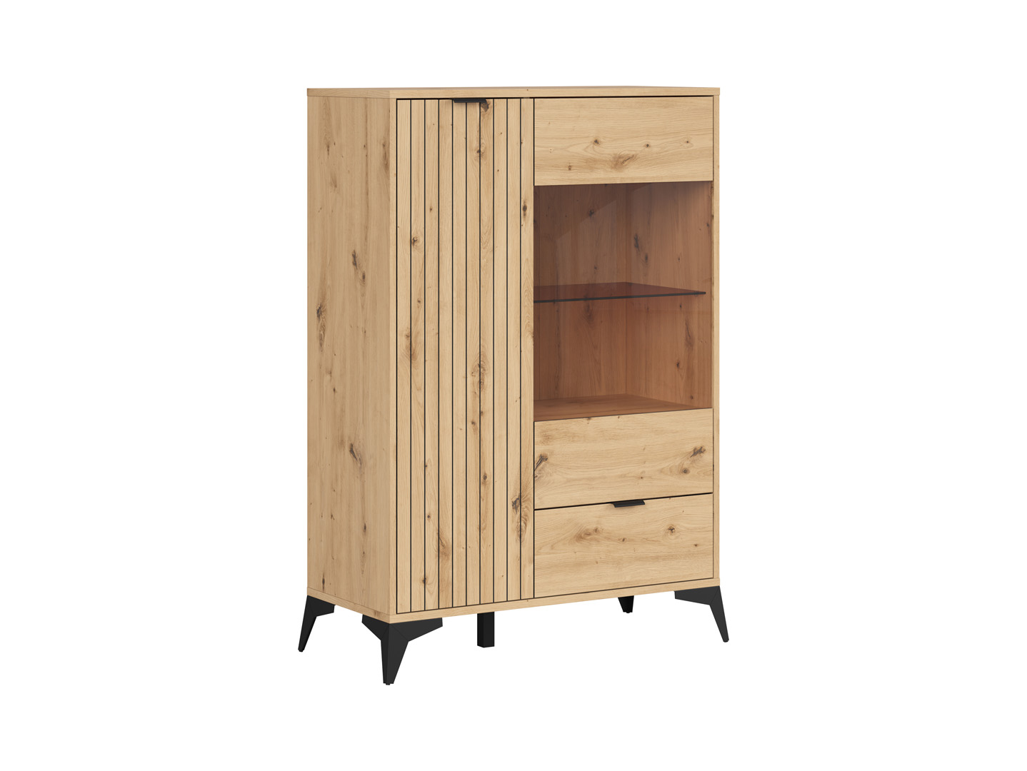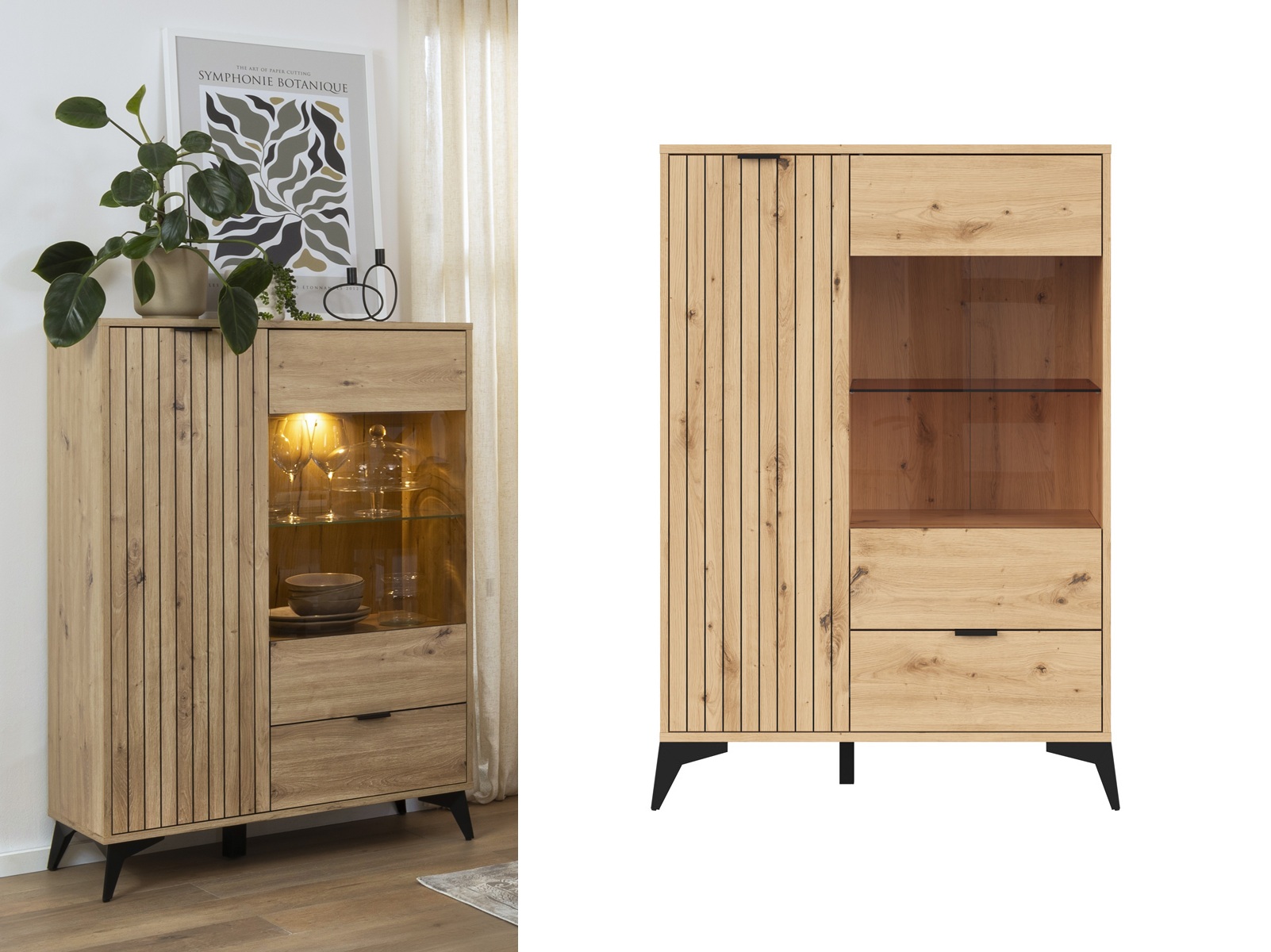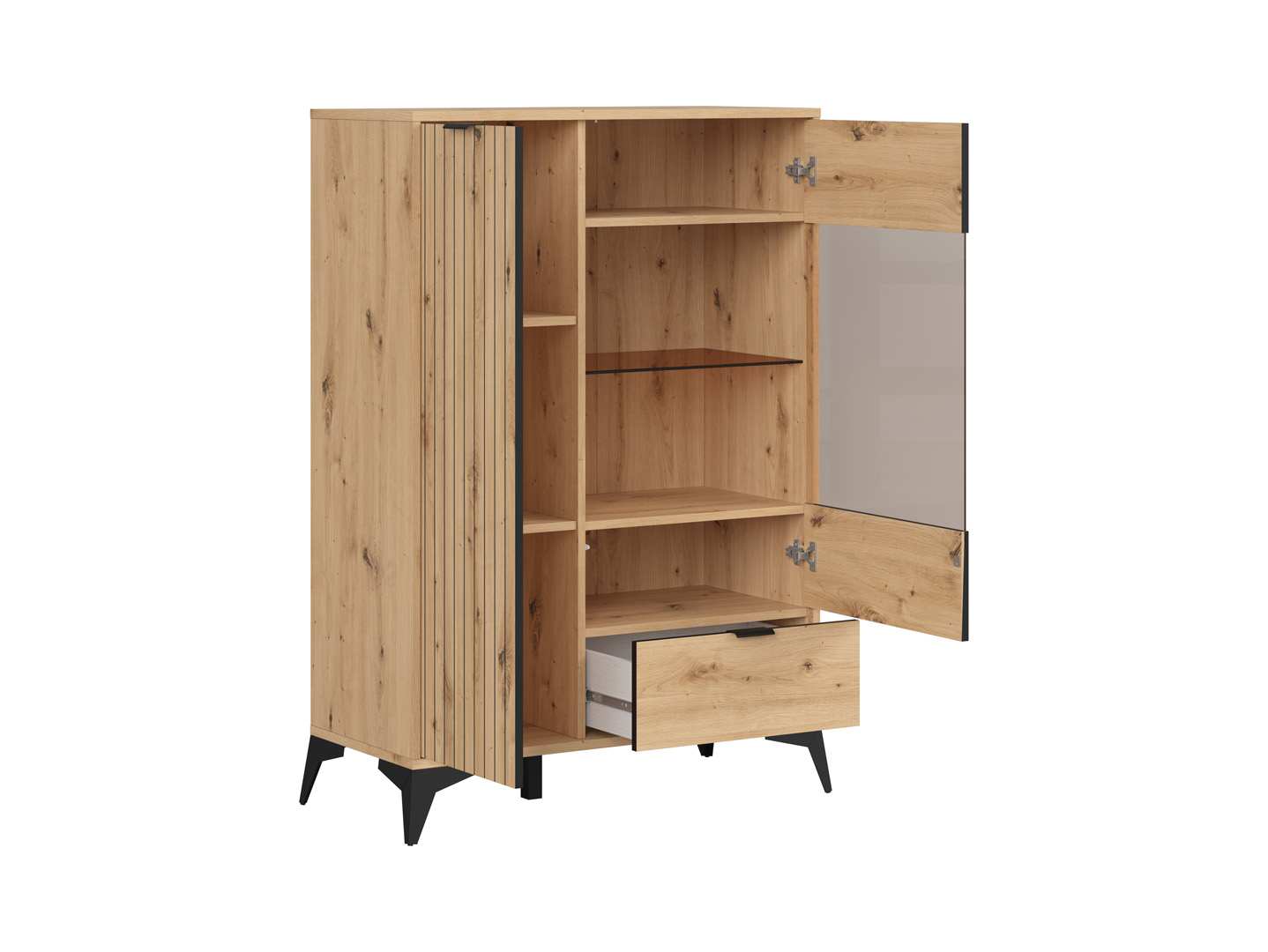 Compact Glass Display Cabinet, with 1 glass door and 1 solid cabinet door, 1 drawer. This modern glass display unit comes in a scratch resistant and high quality Artisan oak effect, with black lacquered slat panelling. This cabinet features subtle black metal handles, soft closing hinges and runners, safety glass door and shelves and slender black legs.