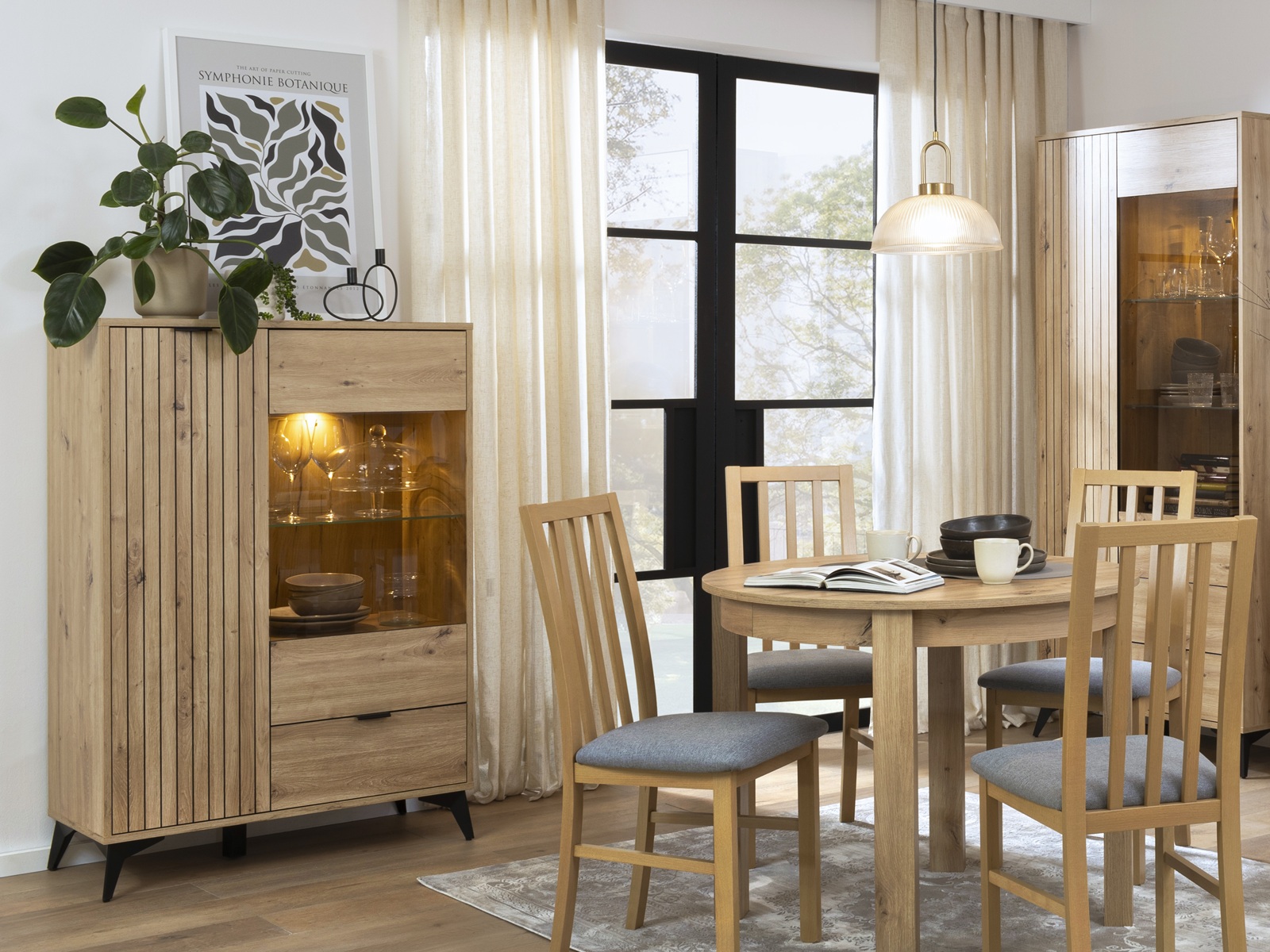The Lamea furniture collection is perfect for any home with pretensions to interior design. Artisan oak effect finish with visible grain and knots, is complemented by black handles and slender legs creating a cozy atmosphere.