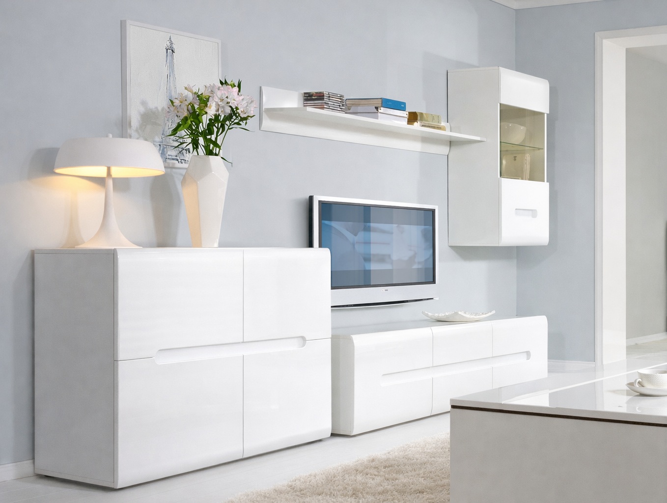 The Azteca Trio range blends smooth high-gloss surfaces with elegant rounded forms to create modern, minimalist furniture. Available in White High Gloss, the collection allows you to customise each piece using decorative accent strips for a personalised finish.