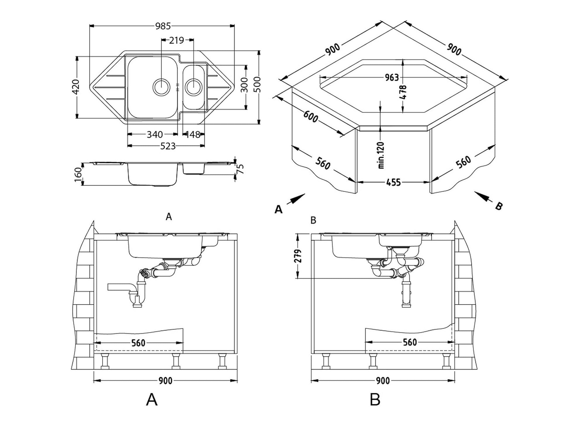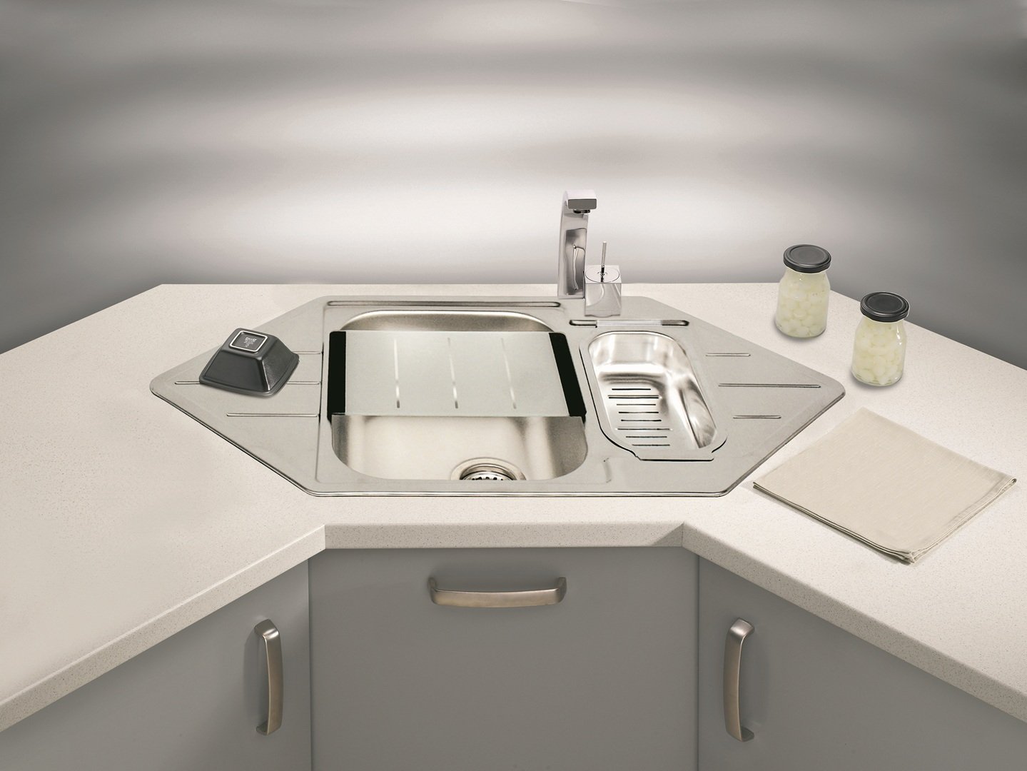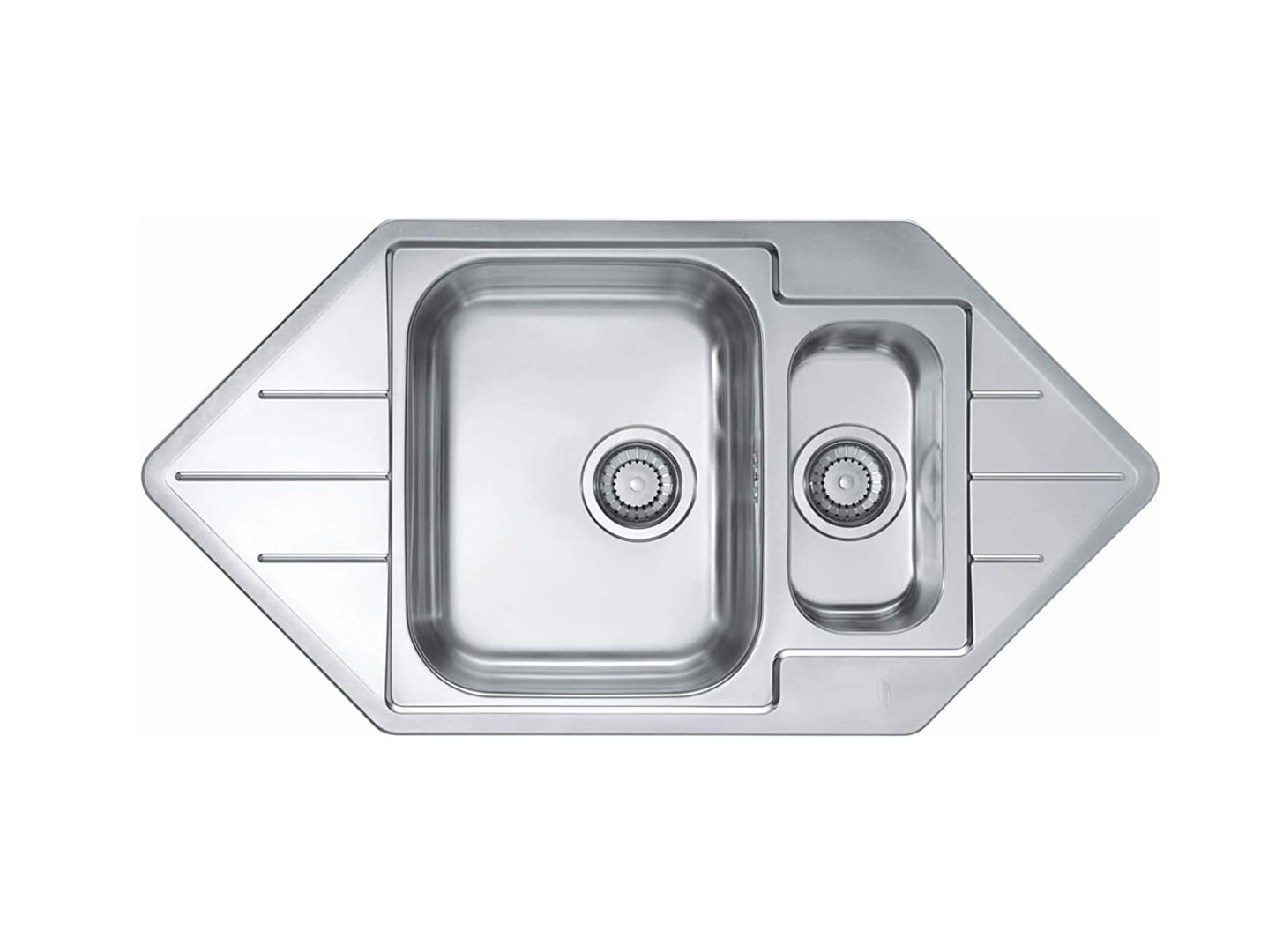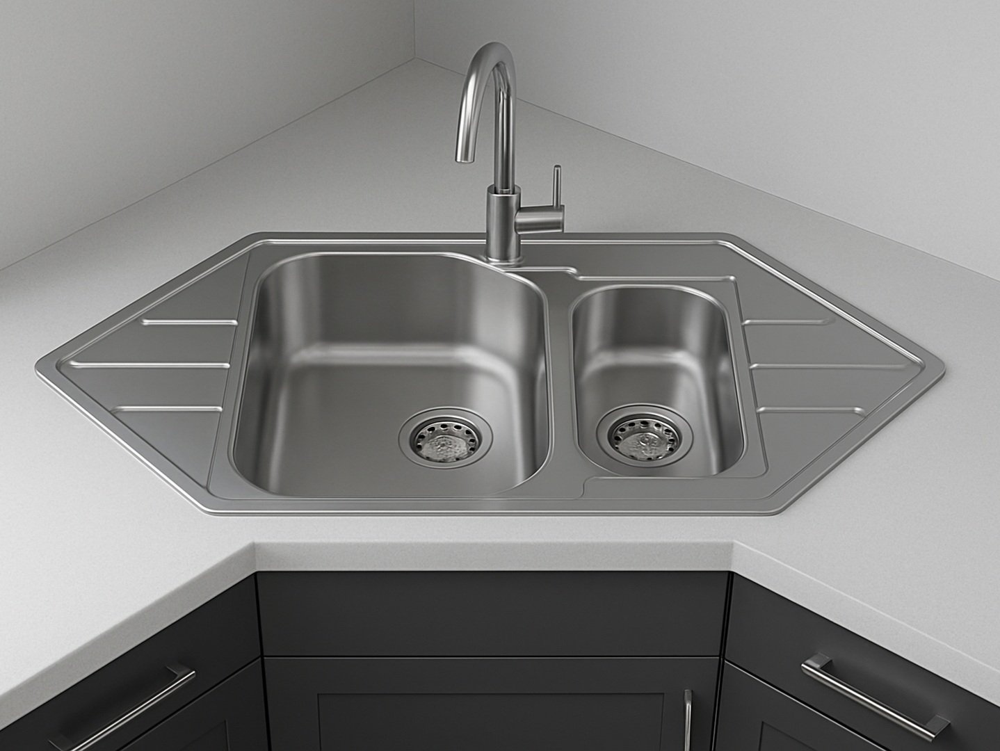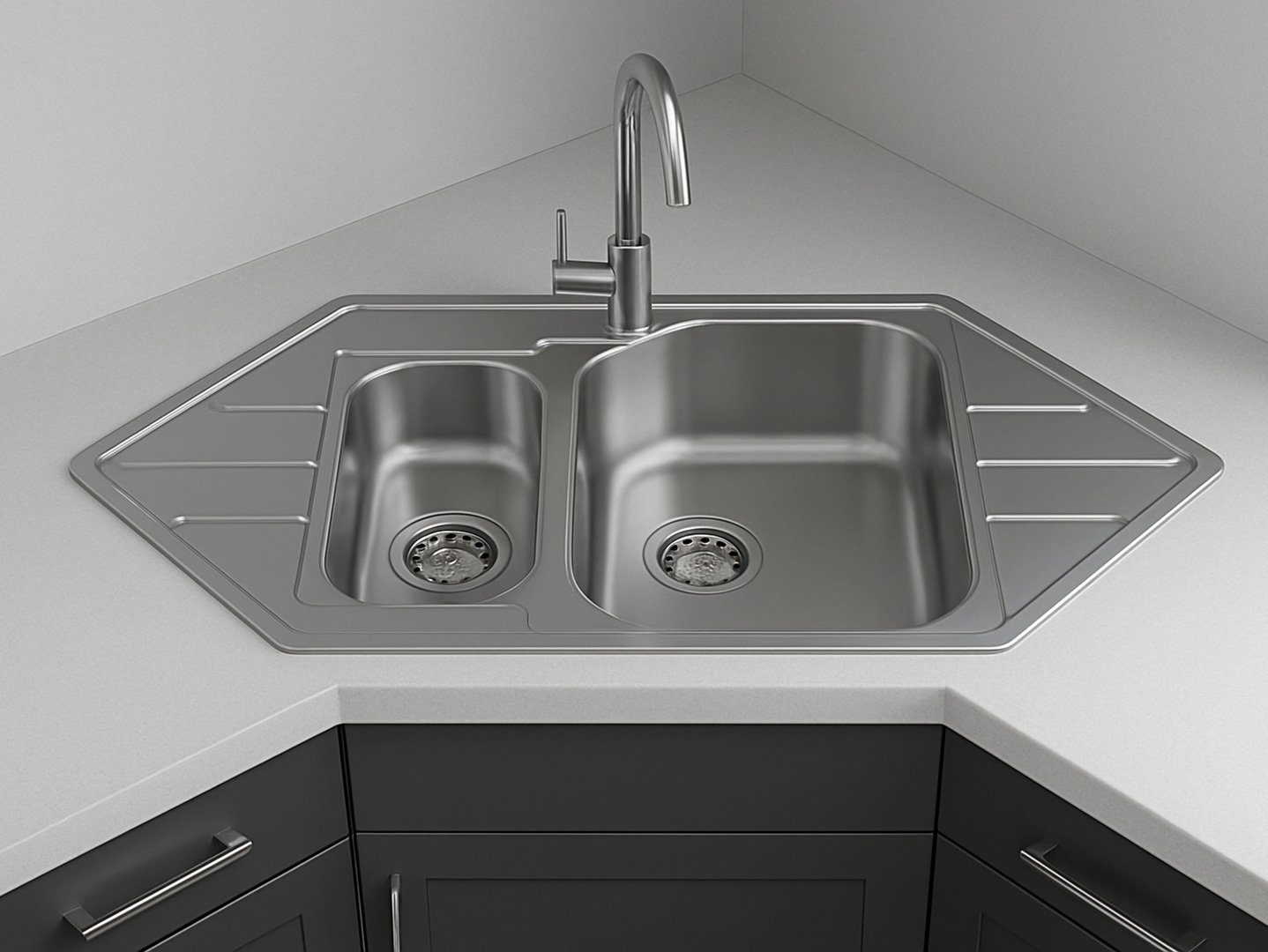 Compact stainless steel corner kitchen sink with integrated drainer. Diamond shape perfect for corner installations. Ideal for small or awkward kitchen spaces where every surface counts. Durable, easy to clean, and ideal for maximising countertop area in compact kitchens or utility rooms.