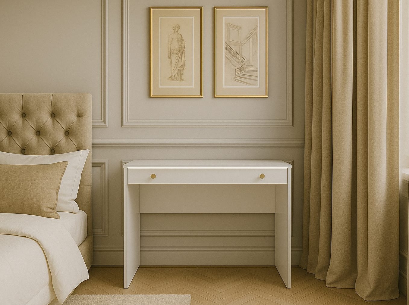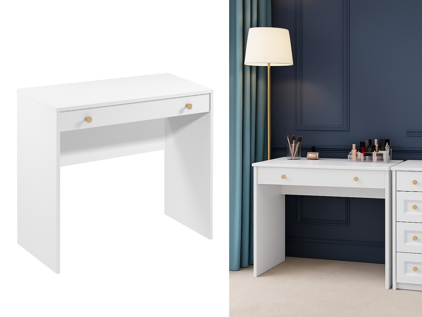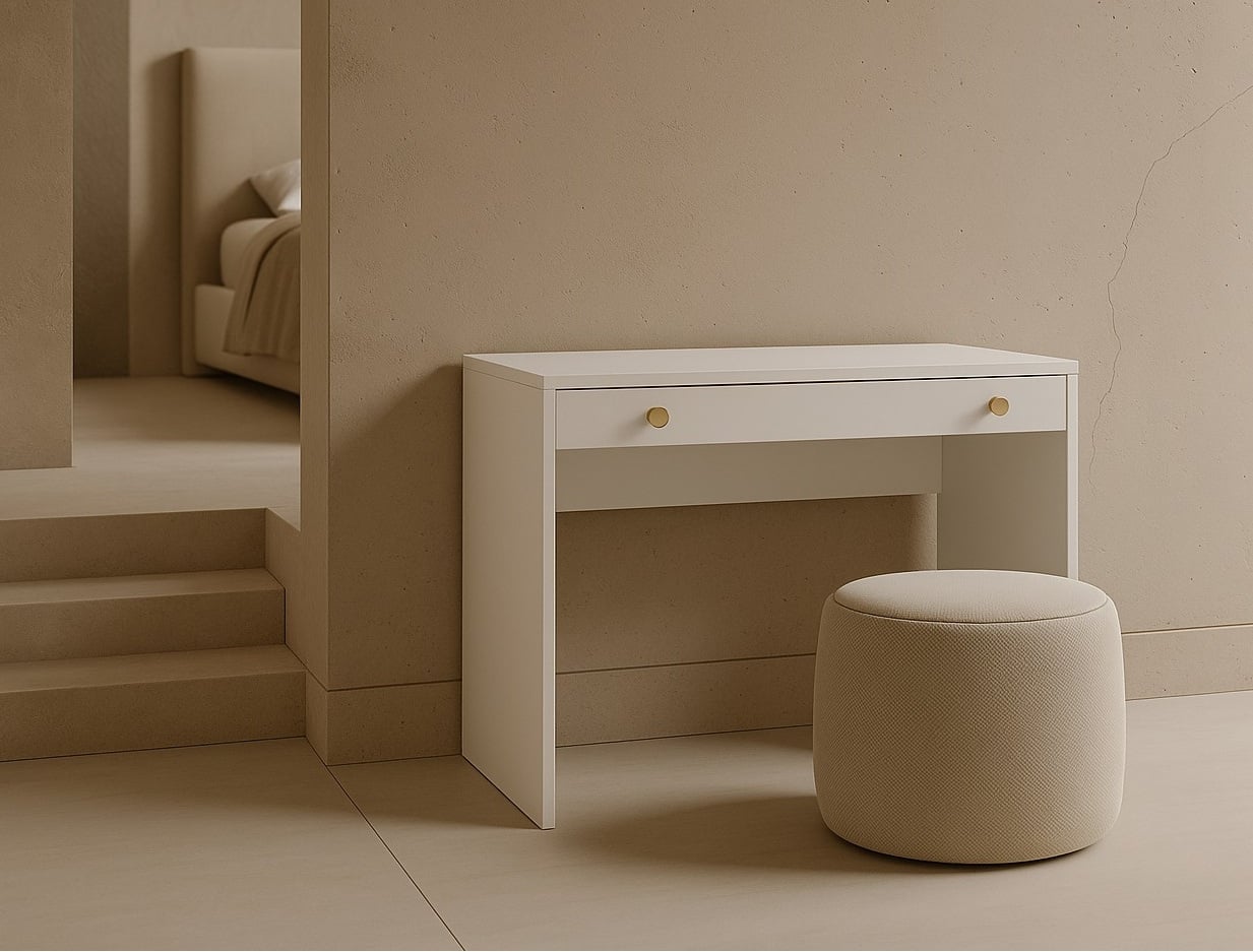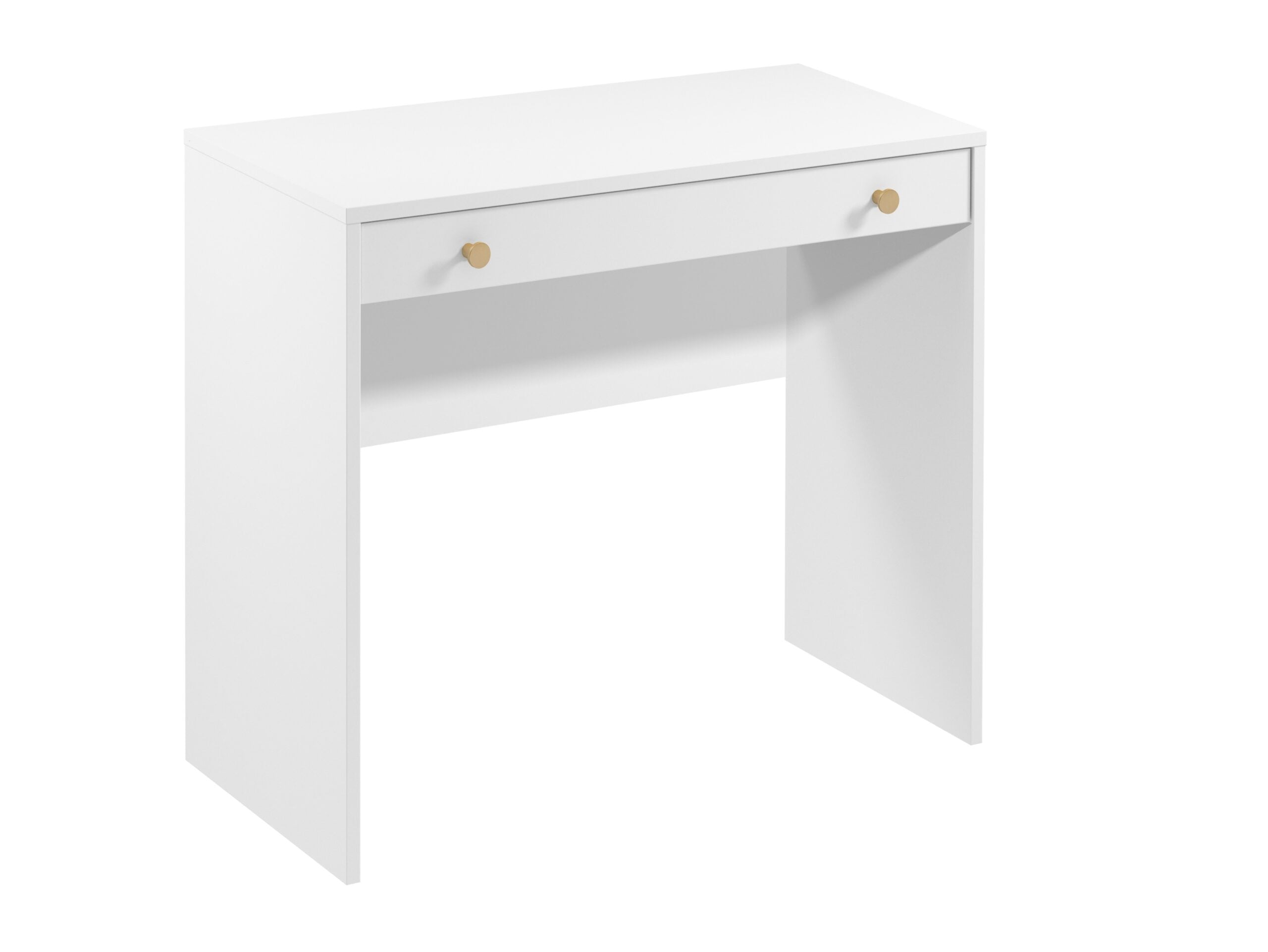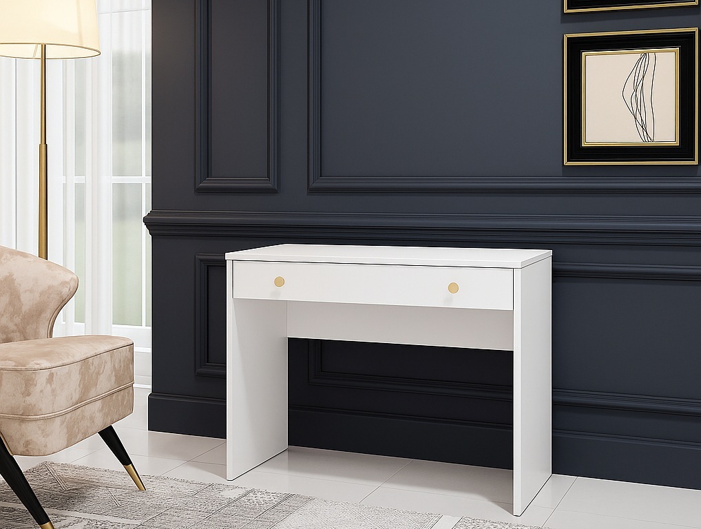 Narrow white dressing table from the Rel space-saving furniture range. Small make up vanity unit designed to fit perfectly into small bedrooms and narrow spaces. It provides storage offering full width one drawer with a white matte 18mm MDF front and an elegant brushed gold knob handle.