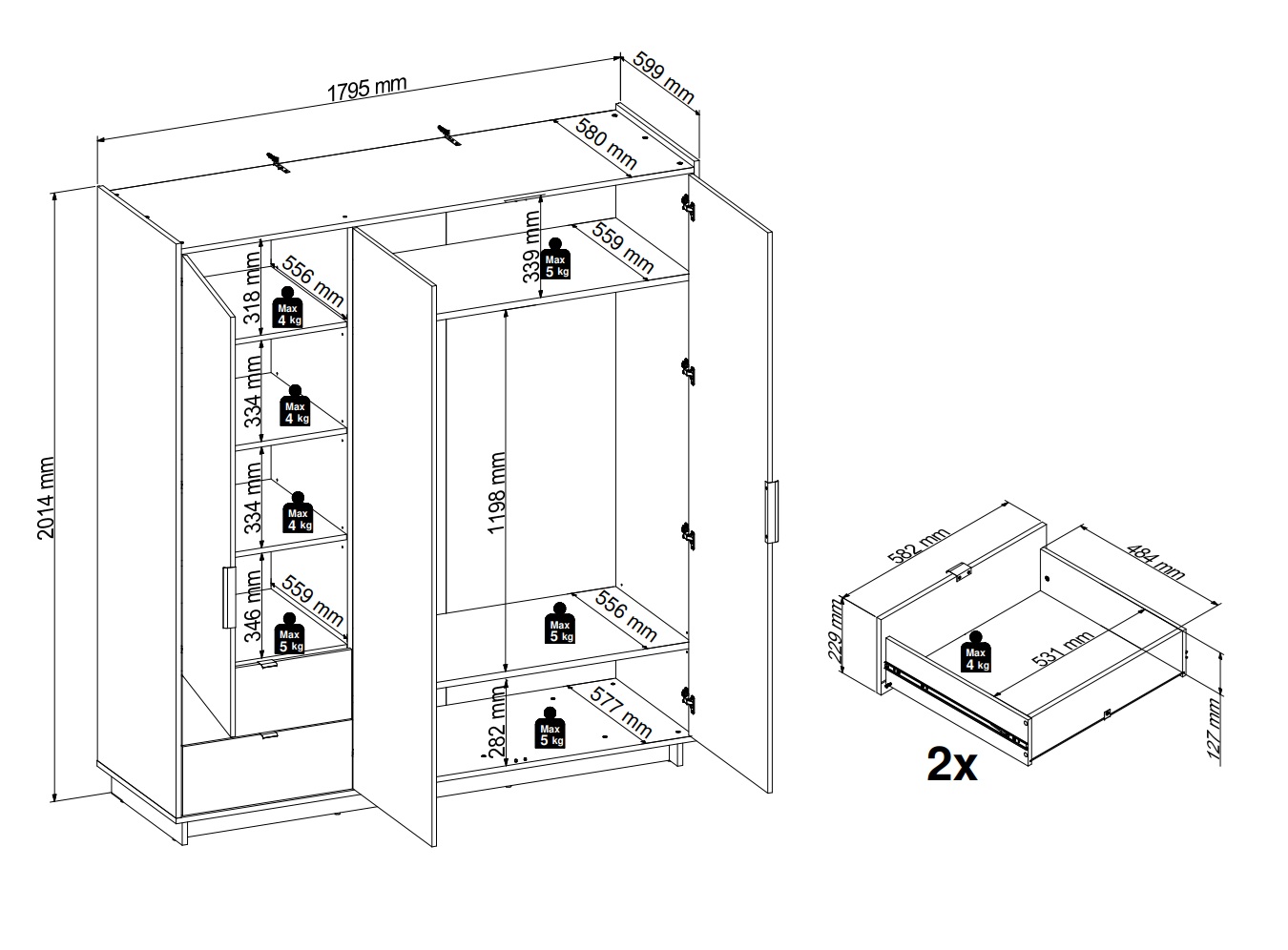 Dalva Triple Wardrobe – Three Doors, Two Drawers (SZF3D2S)