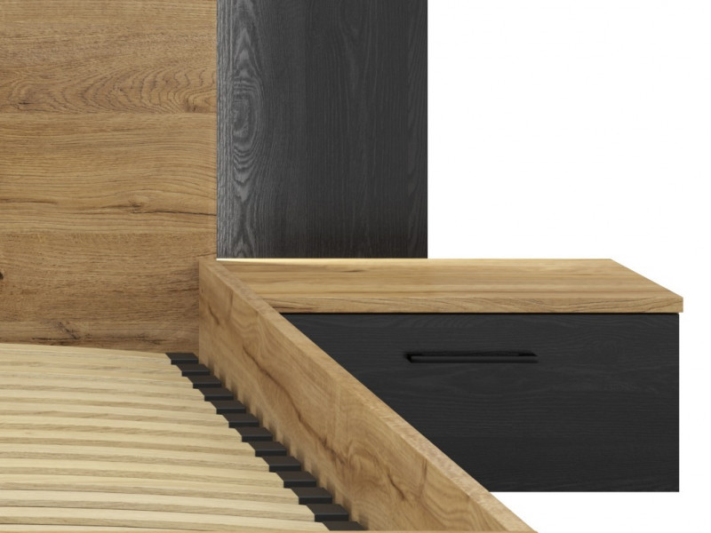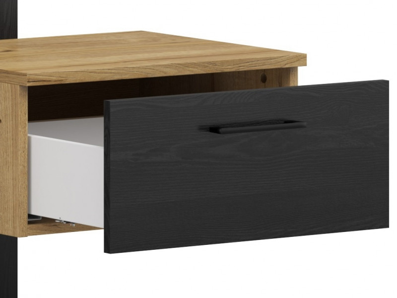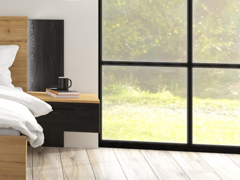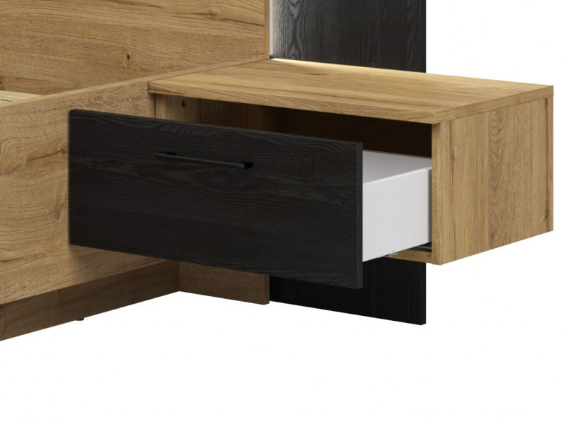 Bedside table cabinet, with drawer and LED lighting in a floating style, the Maio nightstand in a rich combination of Waterford oak and black oak effect finish features soft closing hinges and runners and scratch resistant finish on top and fronts.