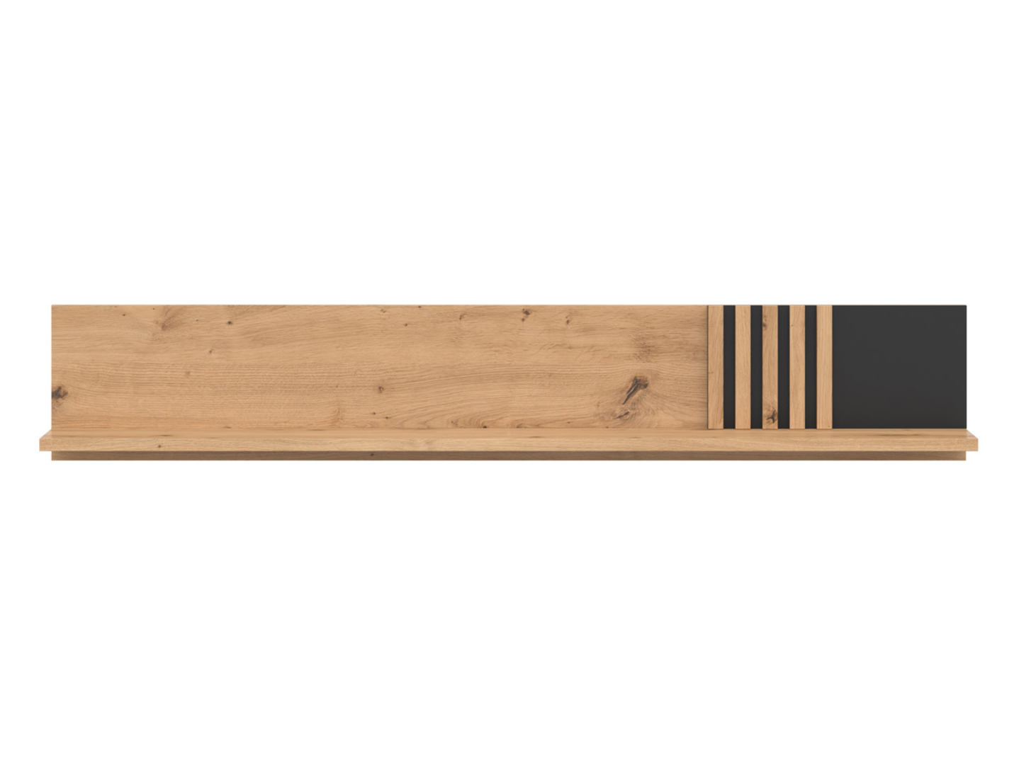Floating open wall mounted shelf in a rich combination of Artisan oak and black matt with a beautiful oak effect slat panelling. This shelf features striking panelling and scratch resistant finish on shelf and back panel.