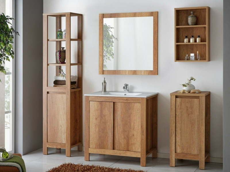 A freestanding 800mm bathroom cabinet furniture set, including 80cm vanity unit, tall cabinet and wall mounted mirror in Country Oak finish from modern Classic Oak bathroom furniture range.