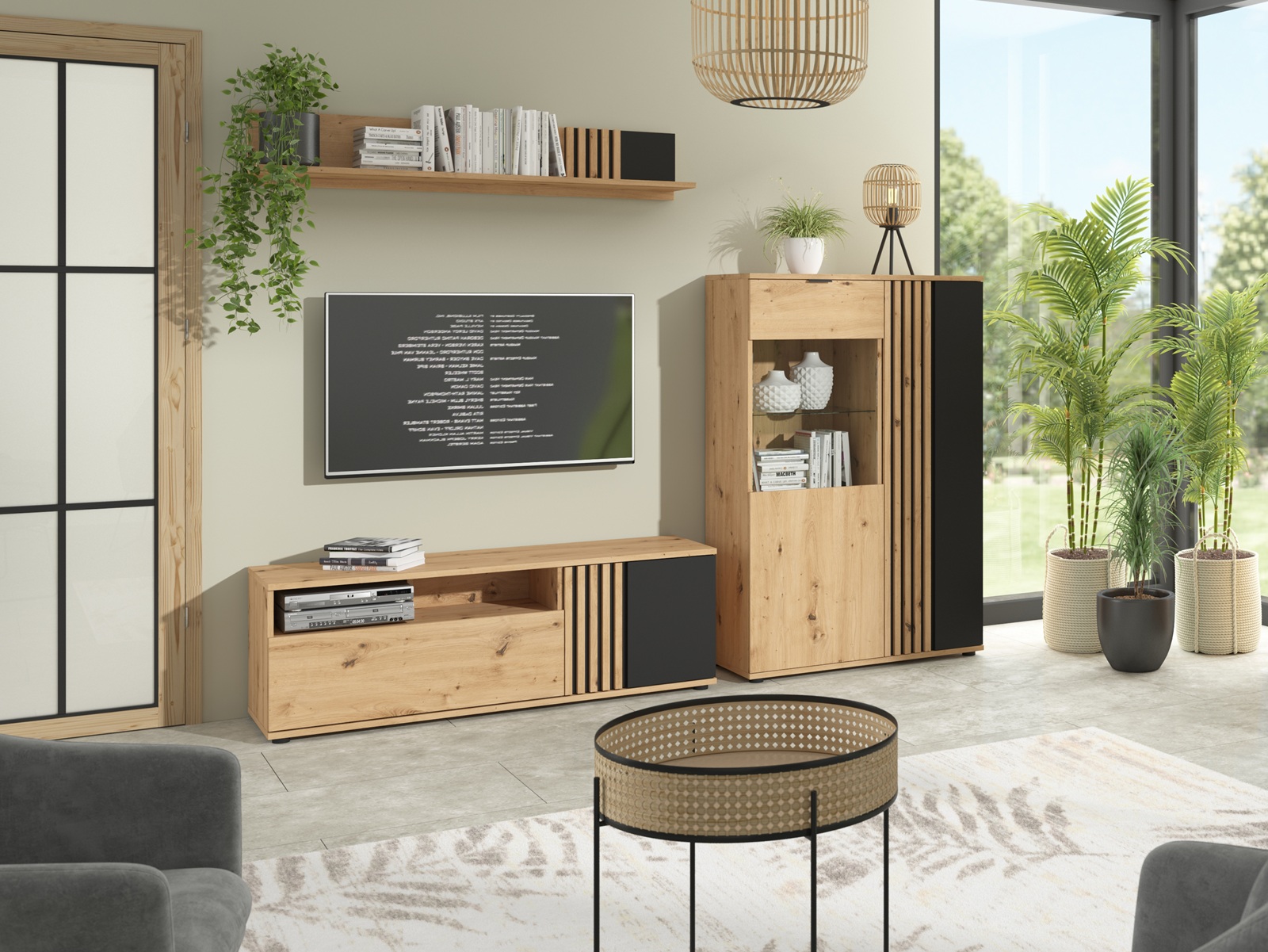 The Vabres furniture range is a great choice for those who appreciate nature in their interiors, finished in a warm Artisan Oak effect finish, perfectly imitating the texture of wood. The furniture’s distinctive features are the MDF slats and black insert, with minimalist black handles to complete the look. The Vabres complements austere loft and industrial spaces, adding a visual warmth.