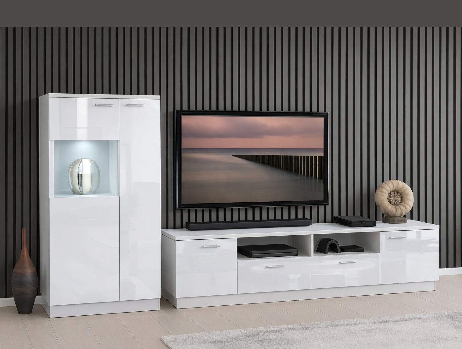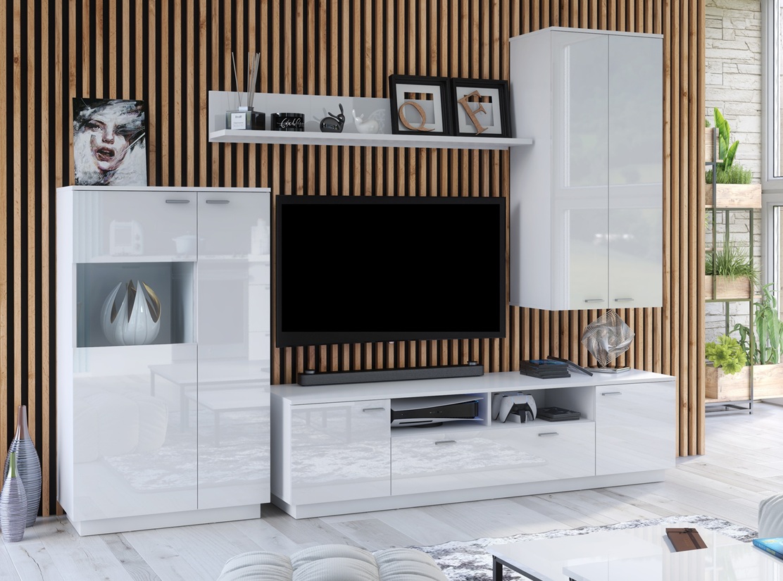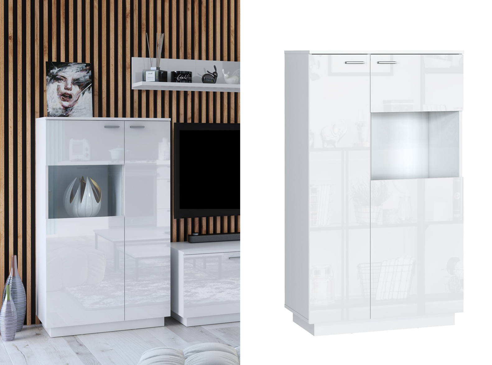 Finished in White High Gloss with glass fronts, the cabinet creates a bright and modern look. Moreover, the slim design makes it ideal for smaller spaces while still offering generous storage.
