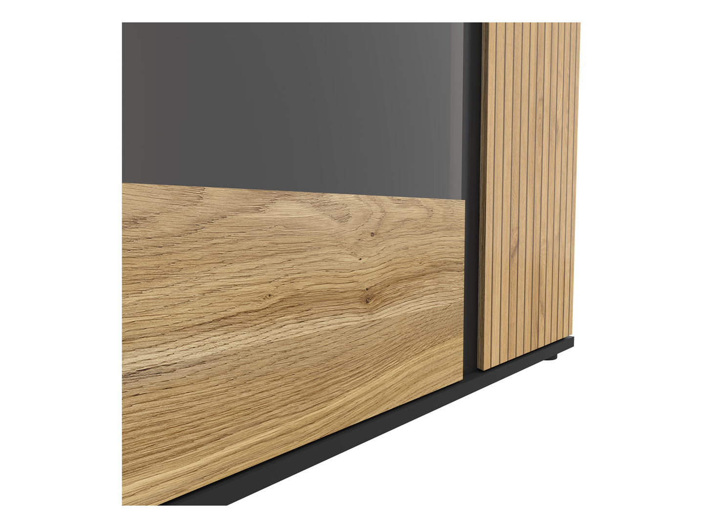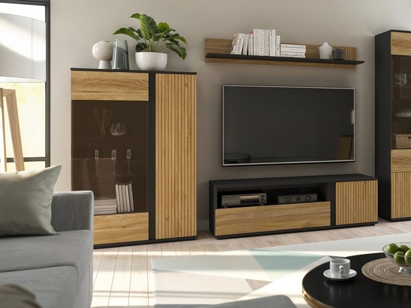 Compact glass display cabinet, living room storage cabinet, with 1 large glass door and 1 solid panelled door. This modern storage unit comes in a rich combination of Mauvelle oak effect and black matt with a beautiful Tegola oak effect slat panelling. This display cabinet features subtle black metal handles, soft closing hinges, glass fronted door and scratch resistant finish on top and fronts.