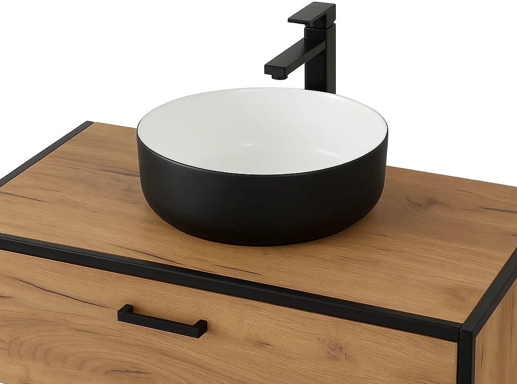 With one spacious soft-close drawer and modern black metal framing, this unit makes a statement in any modern or loft-style bathroom. The mix of warm wood tones and industrial elements adds a unique touch of luxury and function.