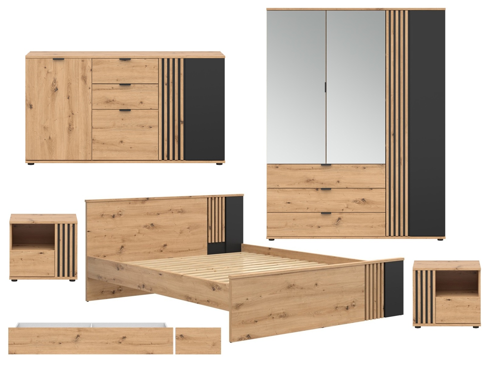 King Size bedroom set, bedframe in Euro 160cm size with under bed wheeled storage drawer, triple wardrobe, drawer unit and a pair of bedside cabinets. This bedroom furniture set is perfect for adding style to any bedroom with its rich combination of Artisan oak and black matt with a beautiful oak effect slat panelling.