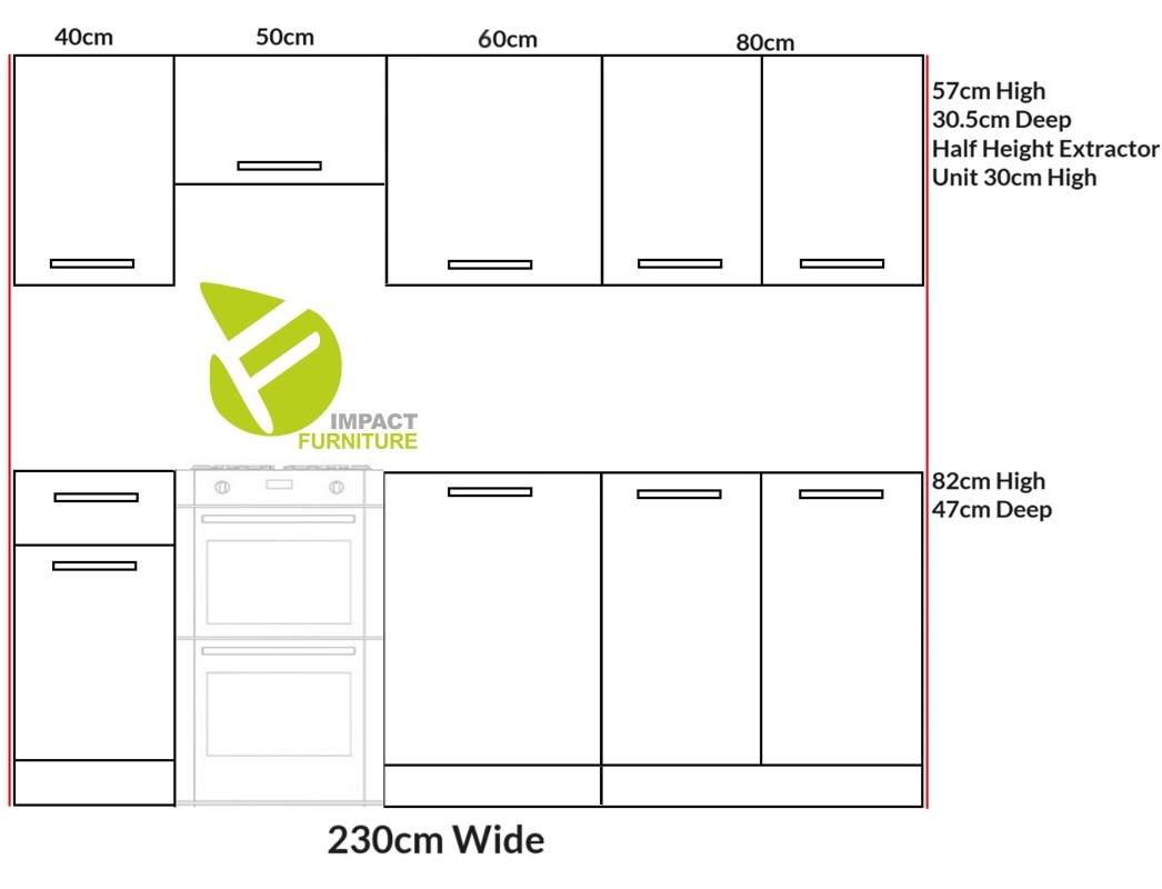 This versatile kitchen set includes everything you need for a compact yet stylish kitchen: a sink base unit, wall cabinets, base storage units, and an extractor wall cabinet. Altogether, the set measures 230 cm in length, though you can easily rearrange the units to suit your layout since each piece is freestanding.
