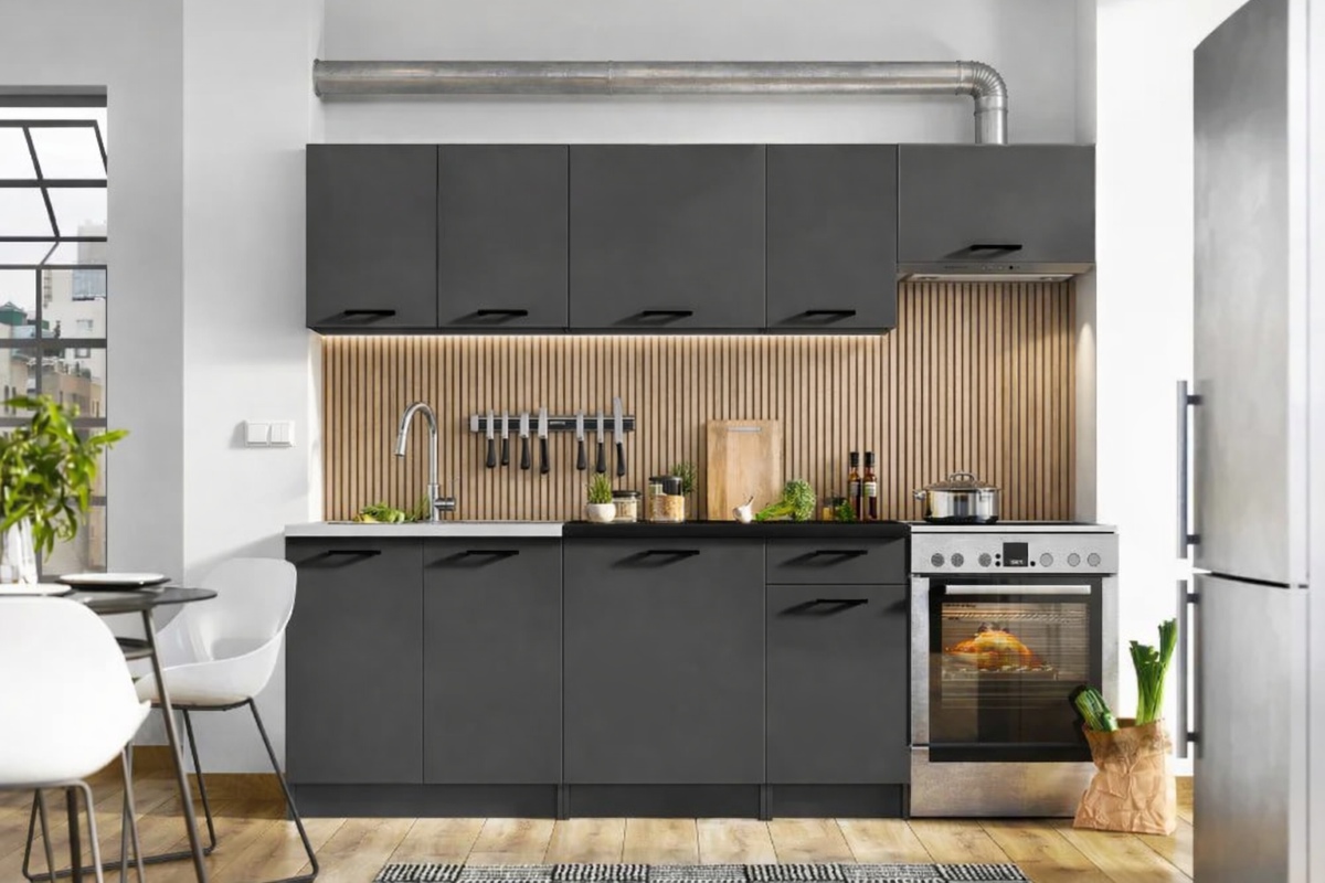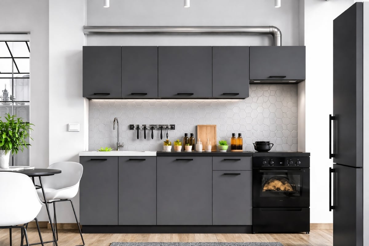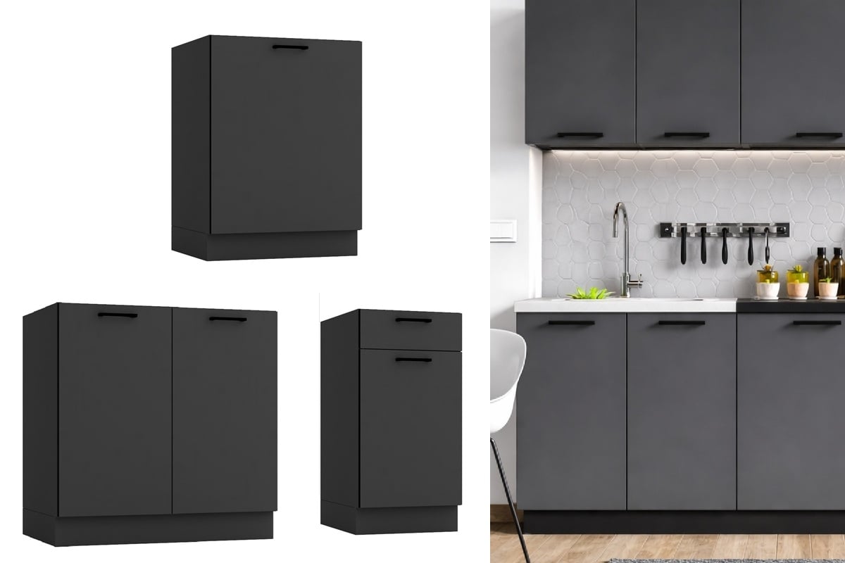 The Lina kitchen range offers modern black and grey kitchen cabinets designed for compact living spaces. Combining anthracite grey doors, a sleek black worktop, and matching black handles, this collection achieves a clean, contemporary aesthetic. Built from 16mm thick laminated chipboard, the furniture is sturdy, scratch-resistant, and easy to maintain, making it a smart choice for budget-conscious homeowners.