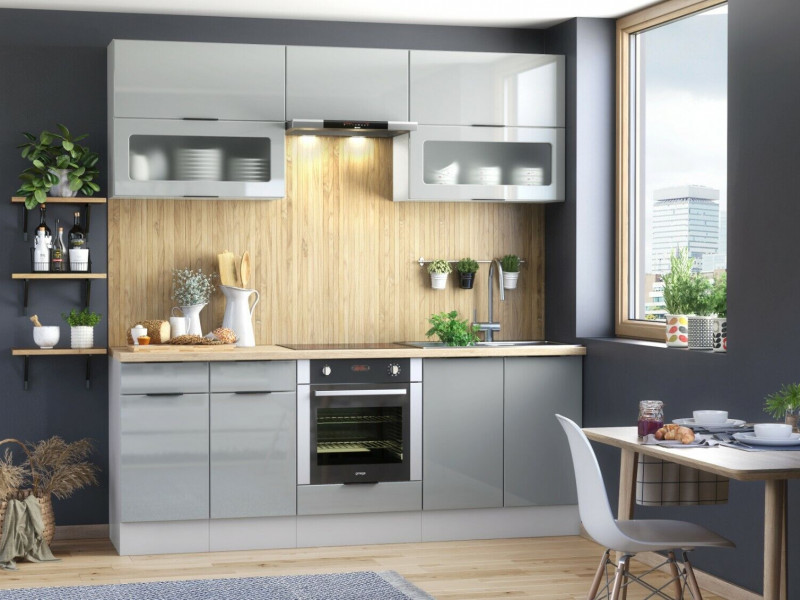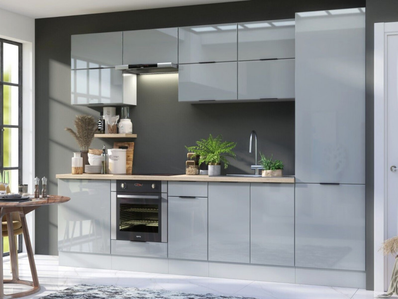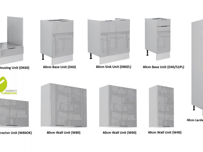 Designer Light Dove Grey Gloss kitchen cabinets set in Scandinavian style including integrated oven housing and a 40cm Larder Unit, a complete DIY kitchen units set covering the length of 280cm. This set of 9 Light Dove Grey High Gloss kitchen cabinets cupboards is sold as a set saving you on the price of individual units., additional matching kitchen units are also available individually.