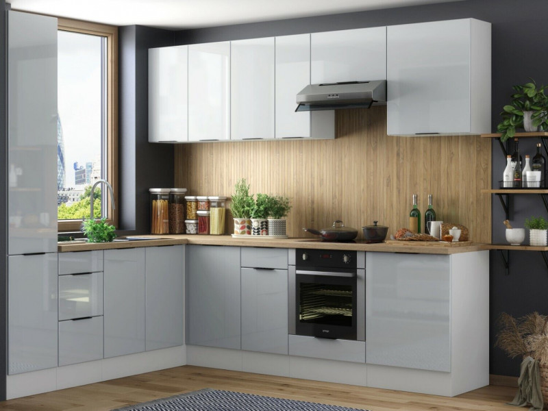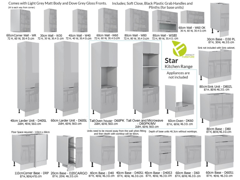 Streamlined minimalist design Light Grey Gloss Star kitchen furniture, this modern range offers a great choice of kitchen units at an attractive price. Beautiful Grey Gloss fronts, with timeless light grey cabinets and stylish Black Plastic Grab Handles. Star is a great addition to your kitchen, optimising space without compromising on style and our modular kitchen units are available to purchase as individual freestanding kitchen cabinets or as a freestanding kitchen units set.