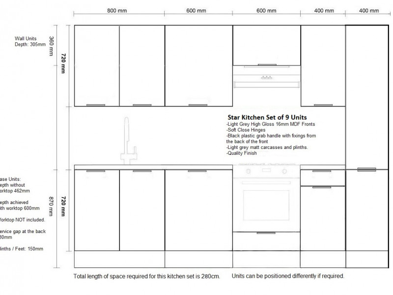 Total length of the set is 280cm and all units including larder, oven housing and base sink unit can be positioned separately and not necessarily in the configuration as shown on the photo.