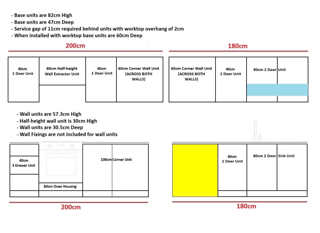 Please Note: The full run of kitchen units is covering 200cm and 180cm respectively for each wall and it is ideal for any corner kitchen or open plan living room.