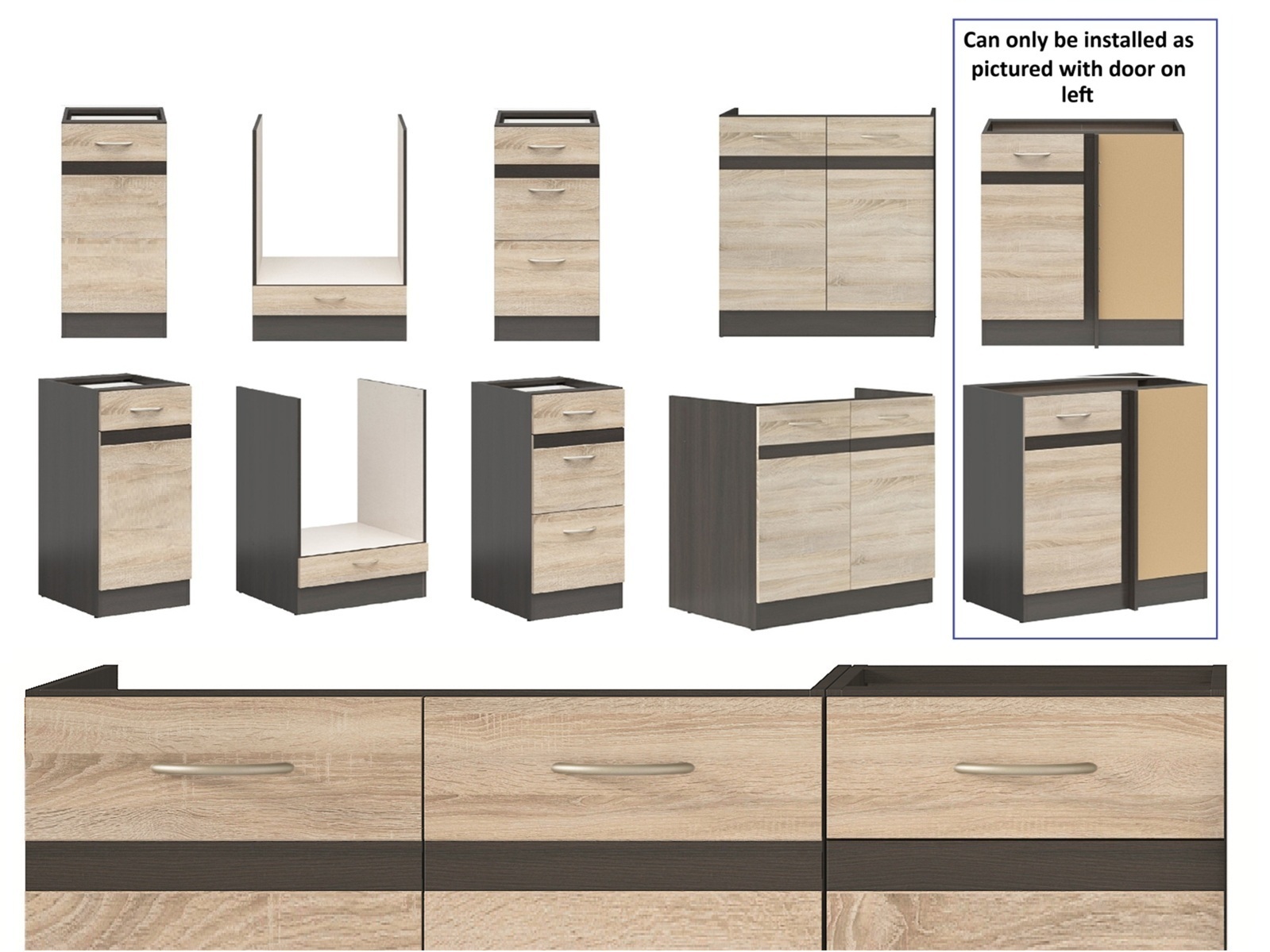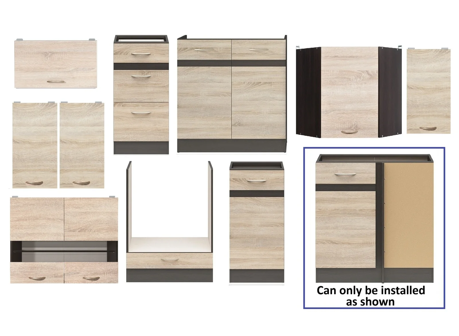 Complete fitted corner wood effect style kitchen set. Fitted kitchen package of 11 DIY corner kitchen cabinets set in Sonoma Light Oak and Wenge Dark Wood Effect finish.
