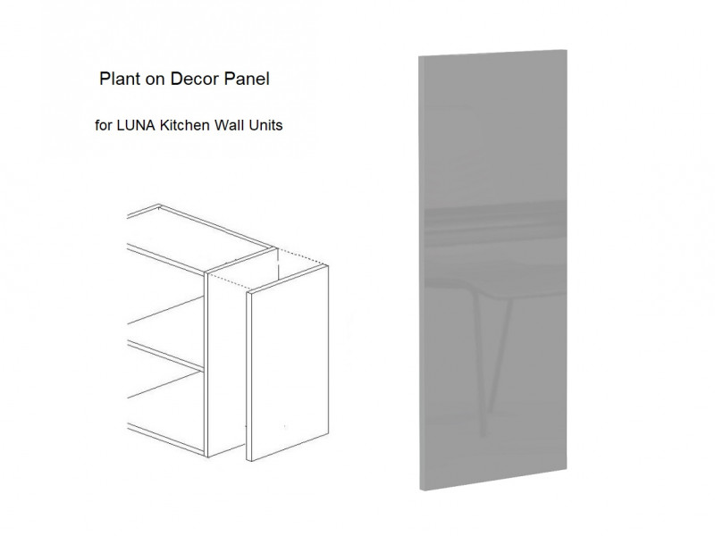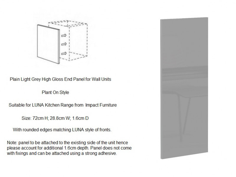 Modern Light Dove Grey Gloss Universal Kitchen Wall End Panel for wall units from the Luna kitchen furniture range. Moreover, these plant-on style panels are designed to be attached to the side of existing installed wall cabinets, offering a neat and seamless finish.