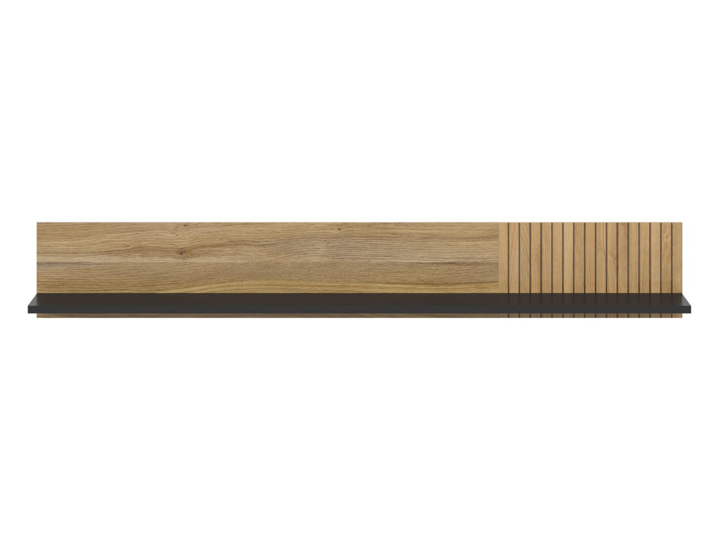 Living room furniture set, tall glass display unit, storage sideboard, wall shelf and TV cabinet. This modern lounge furniture set comes in a rich combination of Mauvelle oak effect and black matt with a beautiful Tegola oak effect slat panelling. The cabinets features subtle black metal handles, soft closing hinges and runners, safety-glass fronted door and scratch resistant finish on top and fronts.