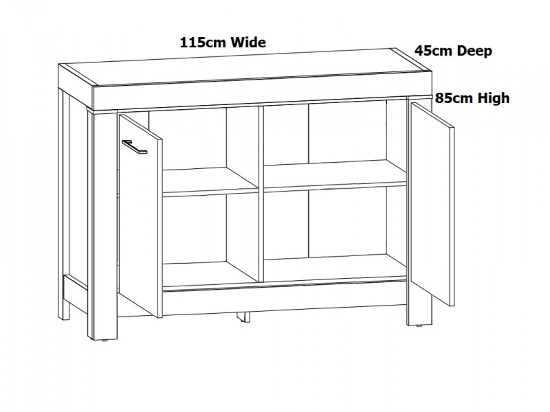 The Gent 2 door sideboard features four storage compartments, and a wide top to display your favourite ornaments. This small sideboard comes in warm stirling oak effect finish with clearly visible and tangible wood structure.