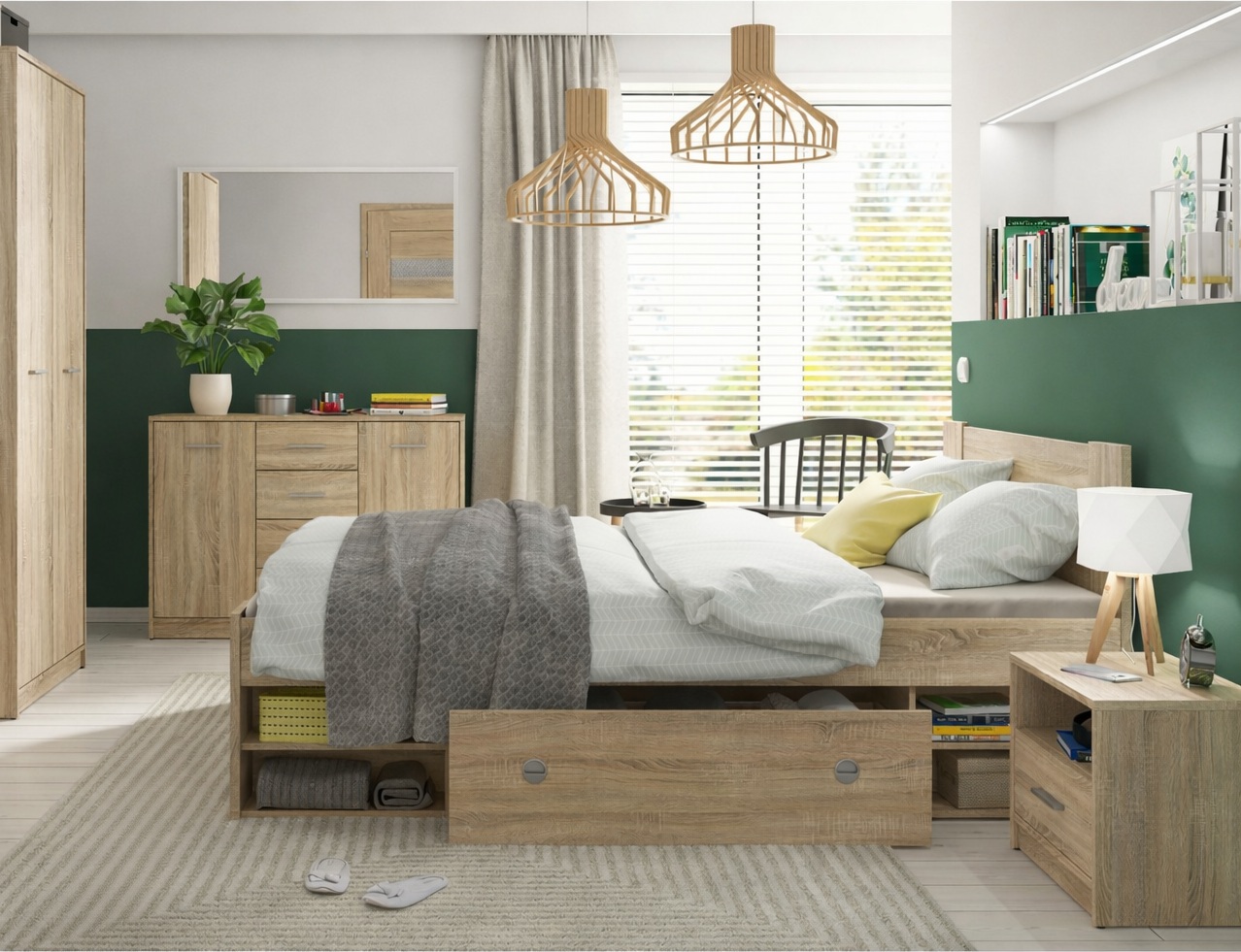 Double Bed Frame with Storage Underbed Drawers Shelves Euro 140cm Slats Sonoma Oak Finish – Nepo