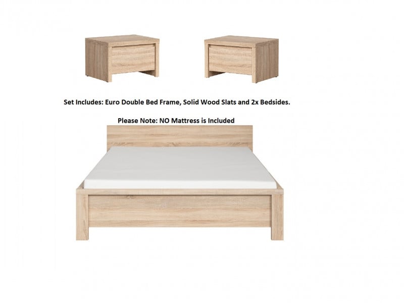 Bedroom Furniture Set Euro 140cm Double Bed Frame Solid Wood Slats 2 Bedsides Sonoma Oak Effect – Kaspian
