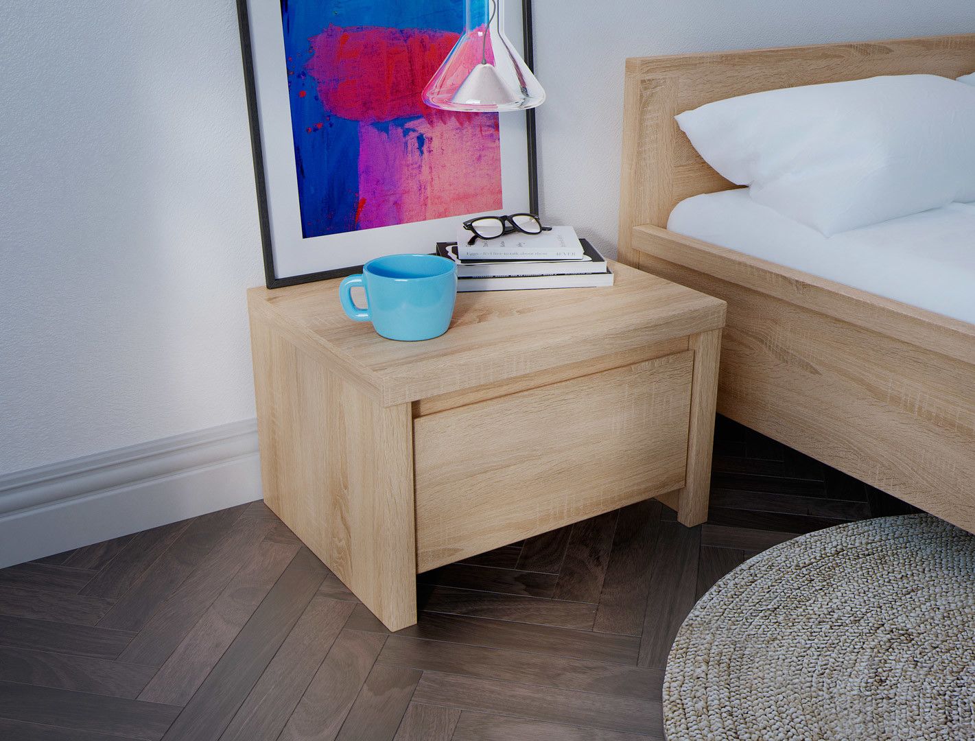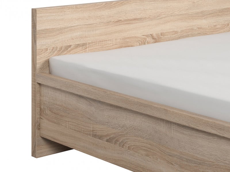Modern double bed frame and bedsides set in minimalist contemporary style and sonoma oak light wood effect finish.