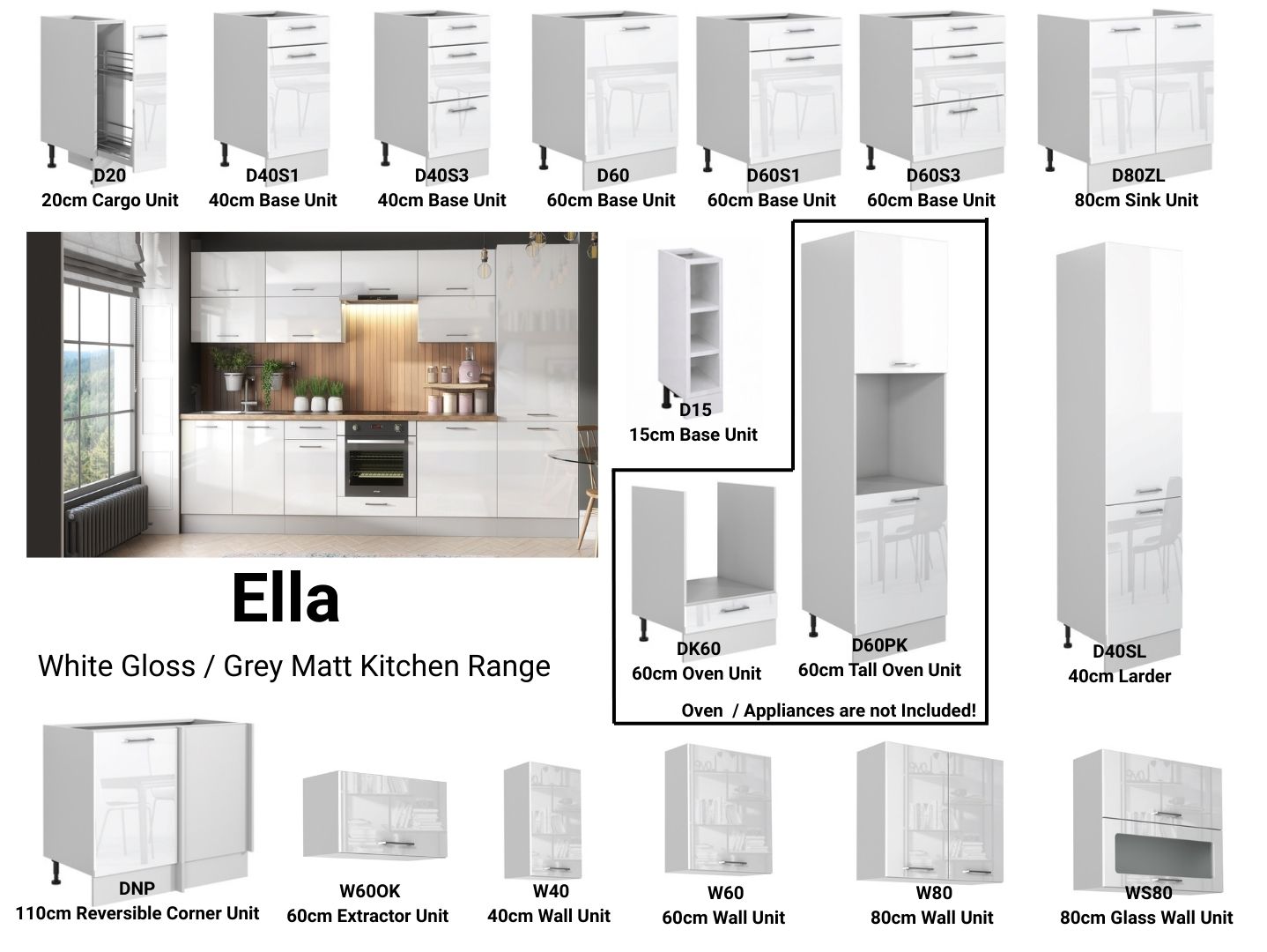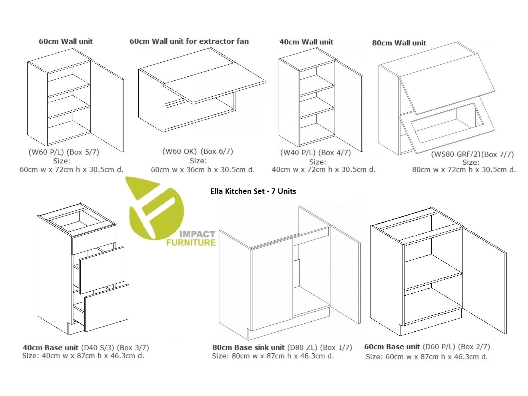 Modern Kitchen Cabinets Cupboards Set of 7 Units White High Gloss Complete 240cm Kitchen – Ella