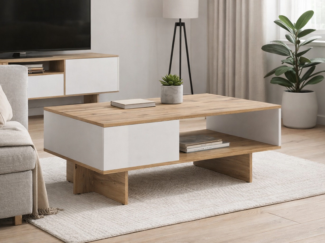 The spacious tabletop provides plenty of room for drinks, books, or décor, while the open box-style compartments below offer handy storage for magazines, remotes, or children’s toys. With its minimalist lines and durable construction, this oak and white gloss coffee table is both stylish and practical.