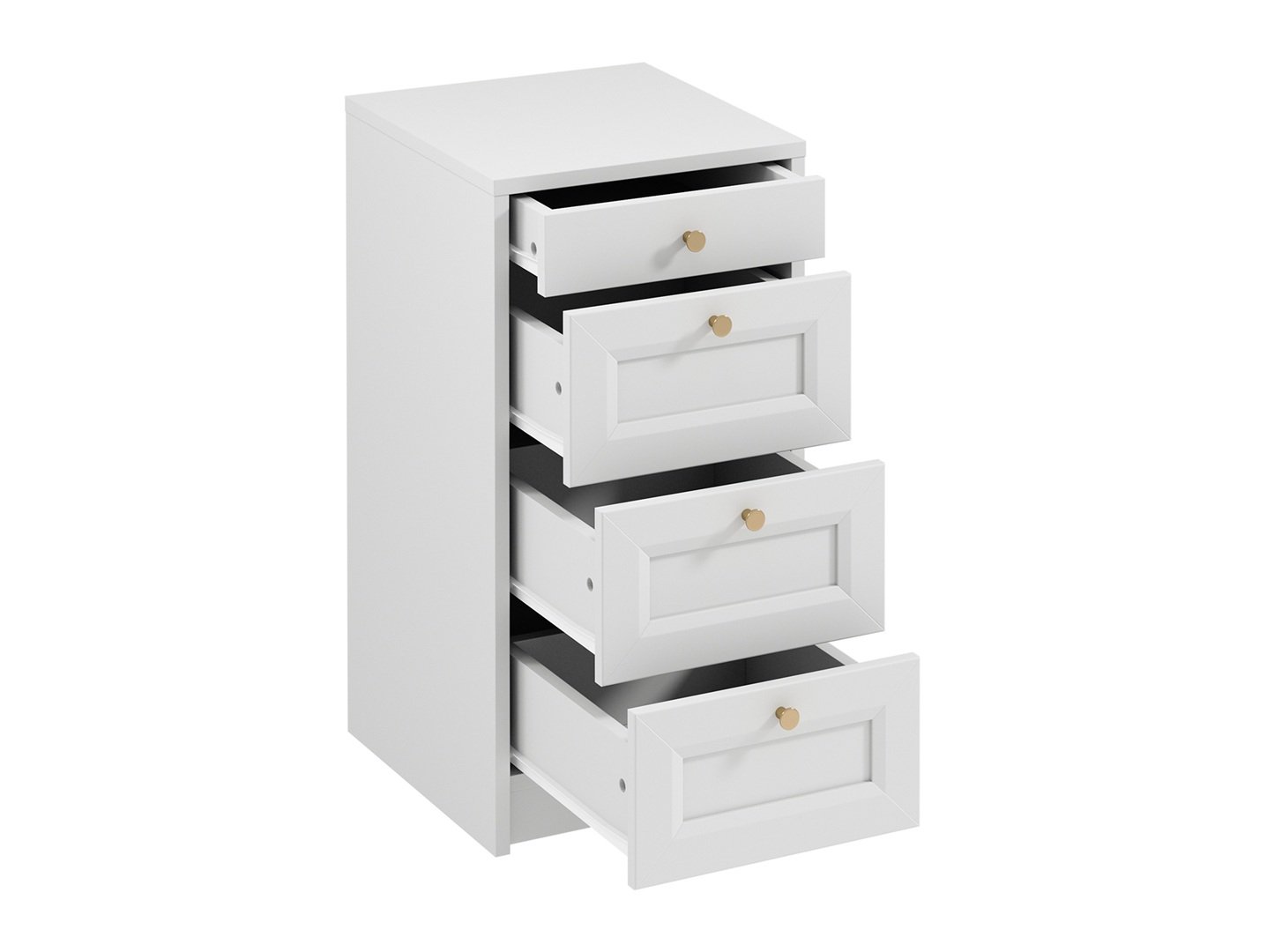 The Rel Narrow Chest of Drawers is a fantastic storage solution for small spaces. White bedroom furniture space saving storage range offers a slimline compact drawer storage unit. This slim cabinet has 4 drawers with White Matt 18mm MDF shaker fronts and brushed gold knob handles. Thanks to its clever slim design, it will allow you to make the most of any small space and utilise every corner.