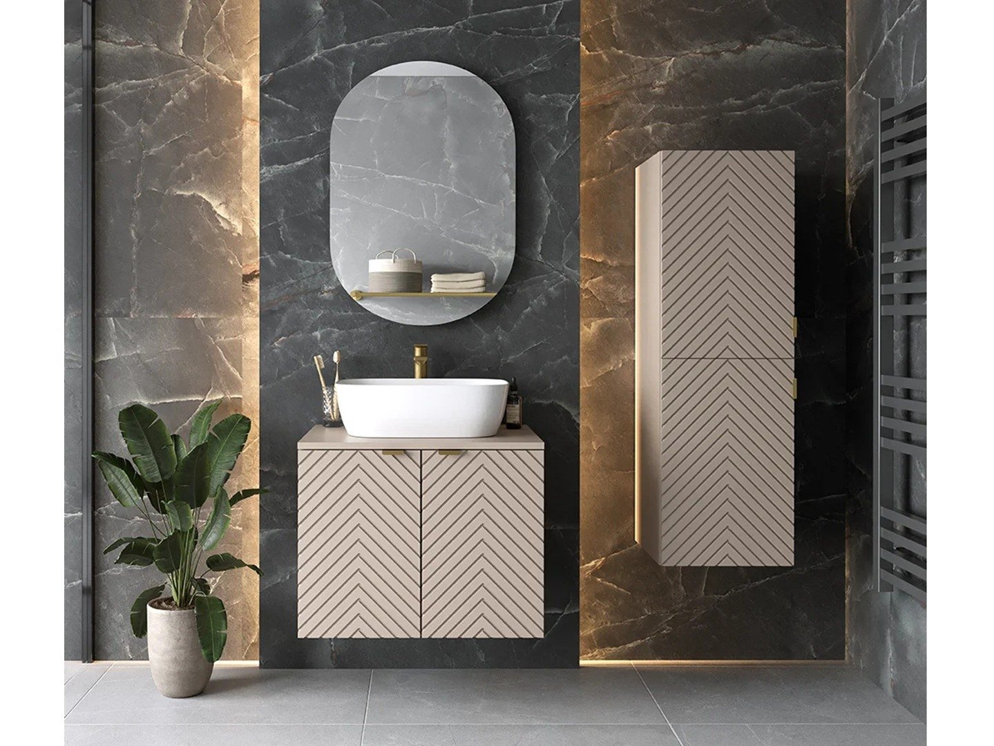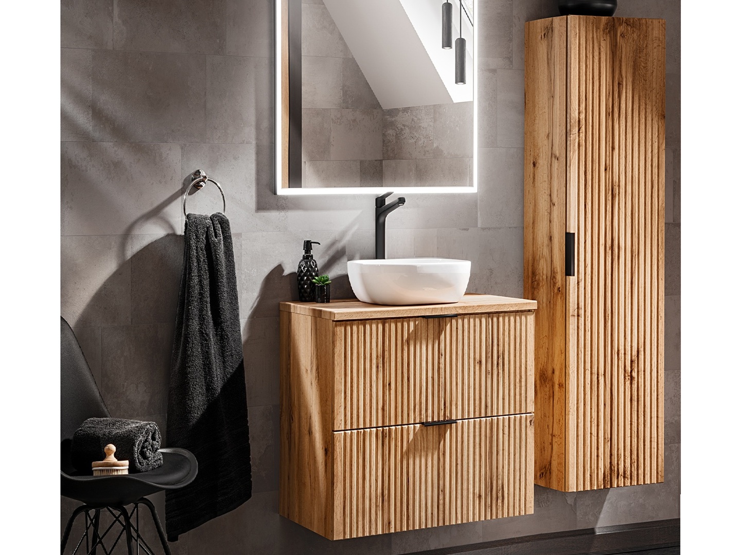 Oak Bathroom Furniture Set Wall Hung Vanity 600mm Countertop Sink Tall Storage Unit Fluted Oak Effect – Adel