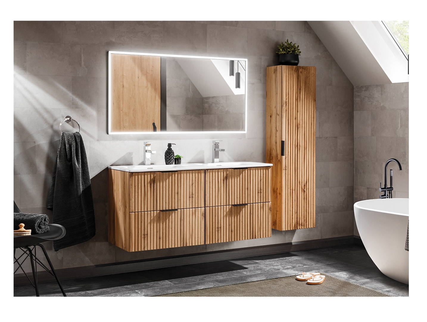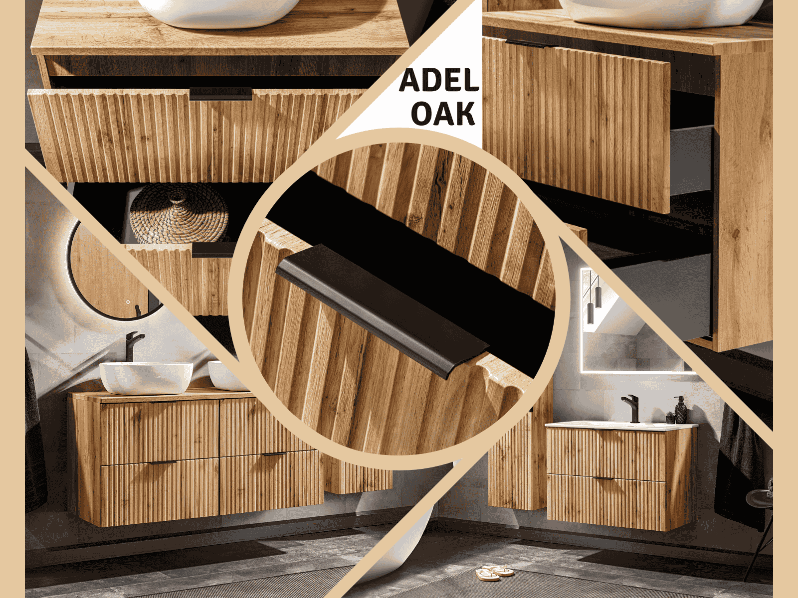 Discover the Adel Oak bathroom furniture collection, a modern European design featuring fluted, ribbed wall hung vanity units in a warm oak finish. Customise your look with handles available in gold, black, or silver. Crafted with precision for durability and elegance, the Adel Oak range combines contemporary style with practical storage.