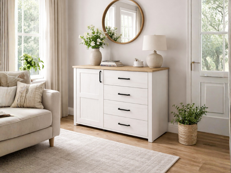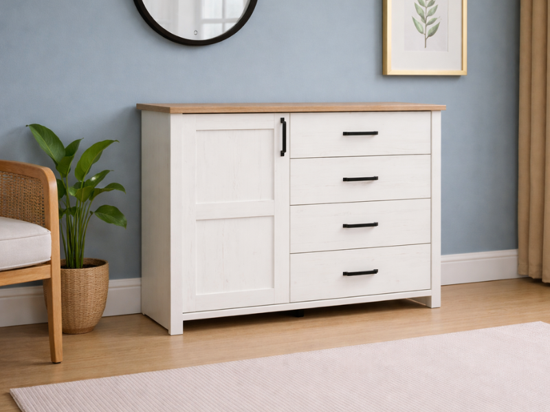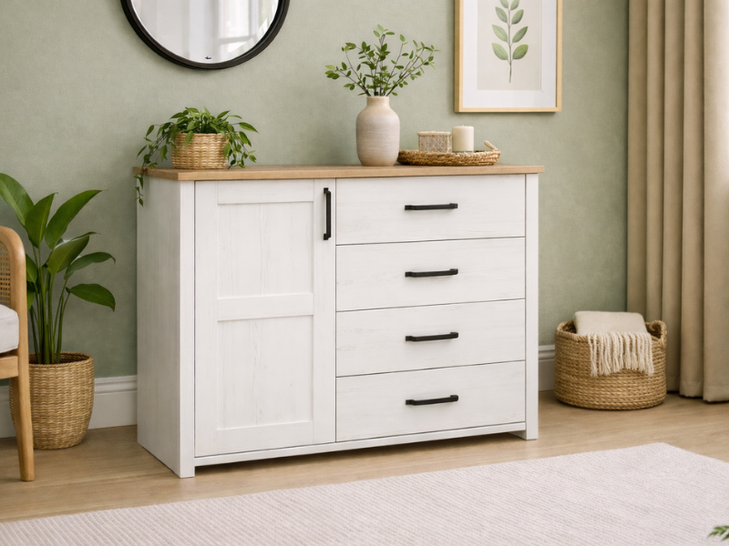 Scandinavian style sideboard cabinet in combination of white pine effect and oak effect top. Compact, yet functional, this 1-door sideboard with 4 drawers offers quality finish and impeccable craftsmanship. Keeping in the timeless theme of Scandinavian furniture, this cabinet offers full soft closing system. The perfect compact storage solution for any living room interior.