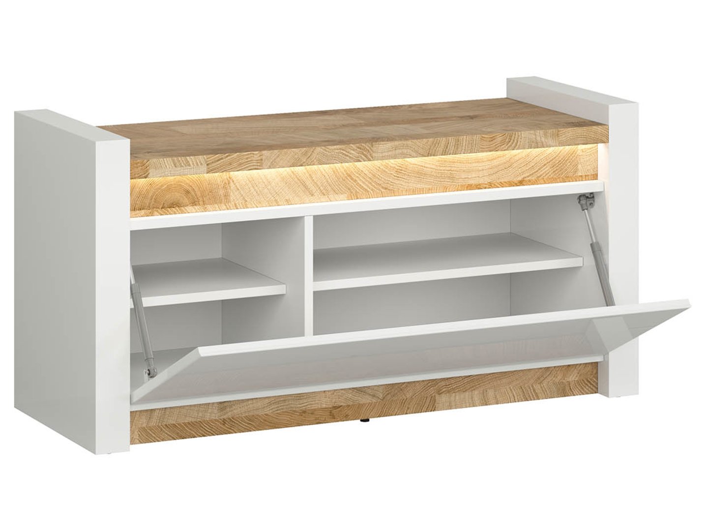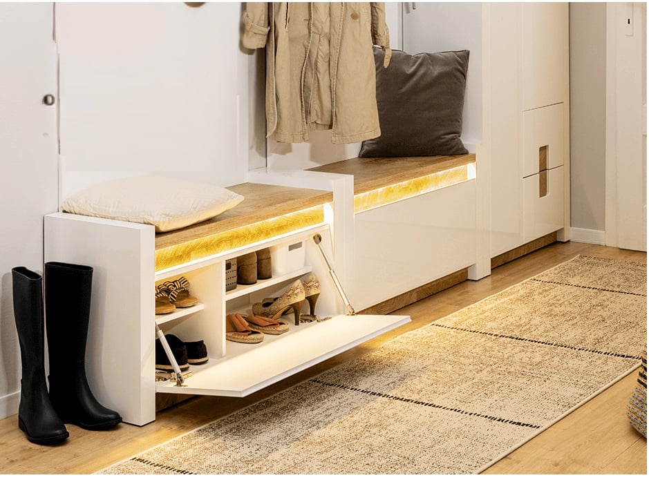 Hallway Shoe Storage Bench Cabinet Drop Down Door Modern White Gloss and Oak Effect LED Lights – Alameda