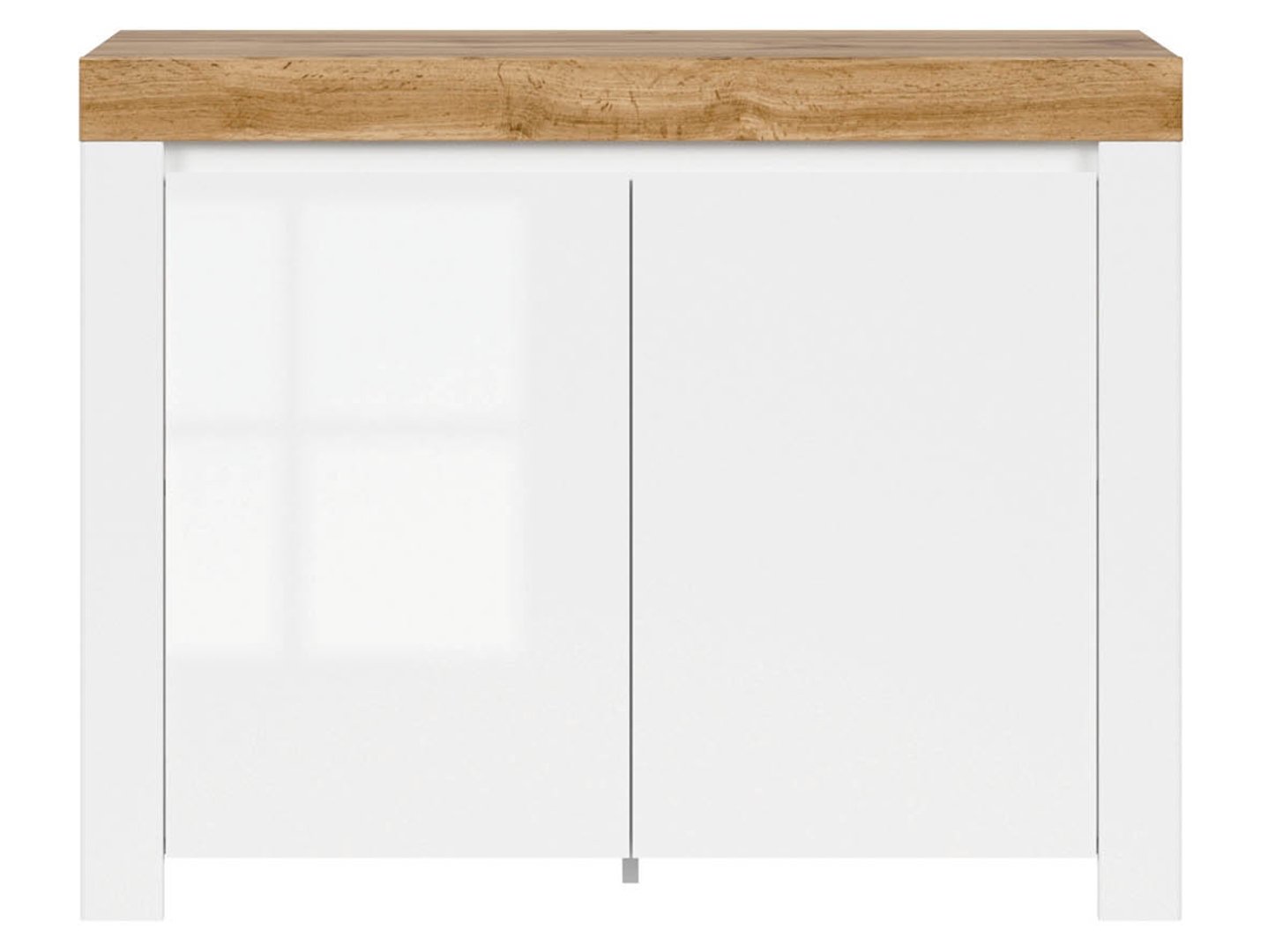 Small white gloss sideboard, a compact 2 door cabinet in White Gloss with Oak Wotan finish top. Scandinavian style sideboard with cabinet storage and two internal shelves. Modern storage solution with soft closing system. Compact slim cabinet perfect for living room, dining room or bedroom. Quality Scandi modrn furniture made in Europe.