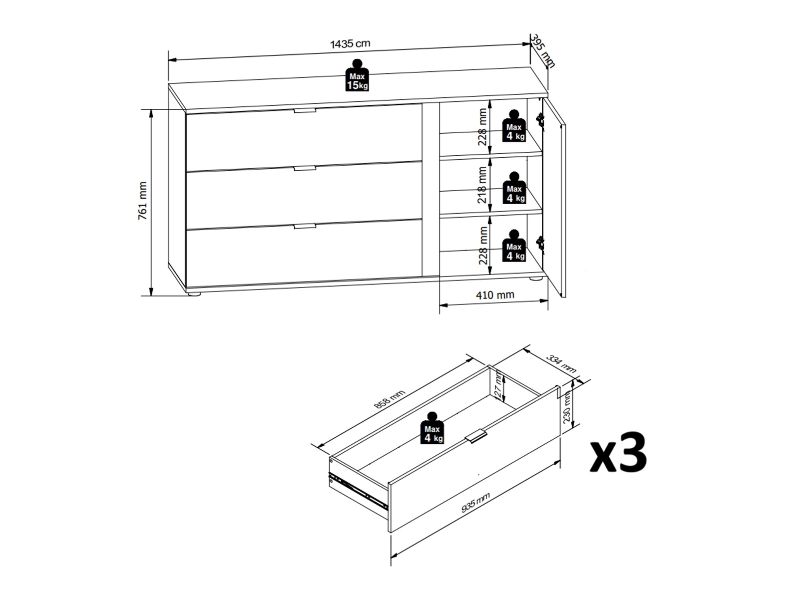 Sideboard Storage Cabinet Three Drawer, One Door Dimensions: