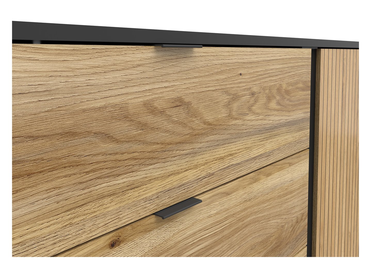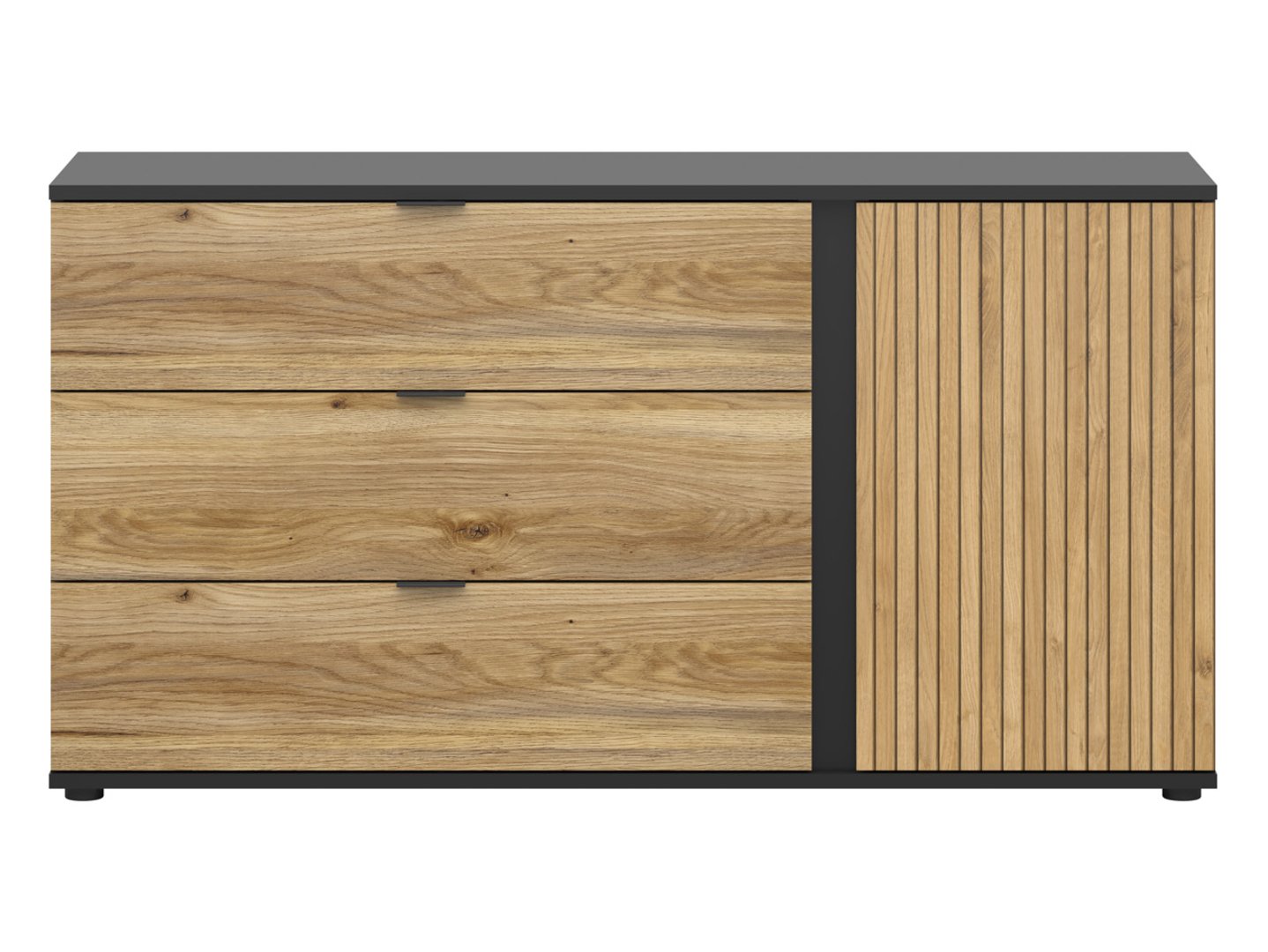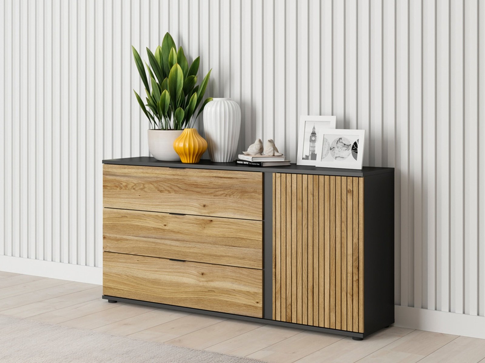 Compact sideboard, hallway or living room storage cabinet, with 3 large drawers and 1 cabinet door. This modern sideboard unit comes in a rich combination of Mauvelle oak effect and black matt with a beautiful Tegola oak effect slat panelling. This sideboard cabinet features subtle black metal handles, soft closing hinges and runners and scratch resistant finish on top and fronts.